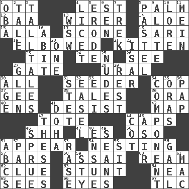 ACROSS 1. Baseball player Mel 4. For fear that 8. Inside of hand 12. Sound made by sheep 13. One who wires 14. Medicinal plant 15. Silent film actress Nazimova 17. Biscuitlike quick bread 18. Indian skirt 19. Shoved, as through a crowd 21. Baby cat 23. Shallow baking pan 24. "___ Little Indians" 26. Perceive with the eye 27. Yard entry 28. Mountain range 30. 100% 31. Sowing specialist 34. Police officer (slang) 37. Turn to the right 38. Lies 39. Mouth or opening 40. Followers of ems 41. Cease 42. Atlas unit 43. Lug 44. Smile enhancers 46. Quiet! 47. French article 50. Bear (Spanish) 51. Become visible 54. Nestling 57. Oblong pieces of solid material 58. Slender Brazilian palm 60. 480, 500 or 516 sheets of paper 62. A slight indication 63. Difficult or unusual or dangerous feat 64. Teachers' org. 65. Perceives with the eye 66. Snake ____ (dice throw) 67. Affectionate concern, for short DOWN 1. Chief or king in Benin or Nigeria 2. Story 3. Baron Munchausen's specialties 4. It is permitted: Lat. 5. Eat (away) 6. Elected rep. 7. Long journey 8. Soft color 9. Having winglike extensions 10. Old wives' tales, e.g. 11. Count _ (2 wds.) 13. Compass dir. 16. "This won't hurt ____!" 20. Single 22. Austrian river, tributary to the Danube 25. Unclothed pictures 27. Small, secluded valley 29. Respite 30. Grow older 31. Proofreading order 32. Artist's stand 33. Biblical high priest 34. Part 35. Mouths or openings 36. Infant food 41. Capital of the state of Qatar 43. College papers 44. Small bed 45. SW Saudi Arabia district 46. Upset 48. Take place subsequently 49. Seines 51. Lettered men learn these first 52. Diluted with white 53. To erase 55. Be seated 56. Highlander 59. Filthy place 61. Big _