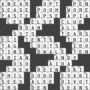ACROSS 1. Approach 6. Choose 9. Fenced enclosure 12. Gospel singer Marvin 13. "Silly old bear" 14. Had on 15. Thick mixture 16. Domed church section 17. Capital of Western Samoa 18. Area sheltered from the wind 19. Otherwise 20. A slight indication 21. Wander 23. 100% 24. Fast planes 25. Separates forcefully 28. Biblical high priest 30. Portable shelters 34. Musical group of three 35. Label 36. Plunders 38. Wedding promise 39. Prong on a fork 41. A sleeping potion; an opiate (poet.) 43. "___ Little Indians" 44. Believer in; advocate of (suffix) 46. Actor Griffith 48. Bear (Spanish) 49. Opera by Verdi 50. Ship's personnel 51. It's straight from the horse's mouth 53. What Jean-Claude Killy likes to do 56. Silvers or Donahue 57. Texas town _ City 58. 1973 Nobel Price Winner (Physics) Leo 60. Perceives with the eye 61. Toward shelter 62. A piece of turf (Scot.) 63. Big collection agency 64. Lair 65. Seines DOWN 1. Cleo's killer 2. Actress Patricia 3. Comfort 4. Michaelmas daisies 5. To sift 6. I made a mistake 7. Introduce or present, as a question 8. Definite Article 9. Teen's desire 10. One of the Great Lakes 11. Teachers' org. 13. Inside of hand 14. Place for singles 19. Artist's stand 20. Feline 22. Baseball player Mel 24. Seigniories (variant) 26. Travel on an animal 27. Within a short period 28. Singer James 29. Den 31. Allow head to fall sleepily 32. Pull behind 33. R.R. building 37. Killed 40. Artist's stands 42. Conclusion 45. At this time 47. Hyrax 49. Assistant 50. "Mermaids" star 51. Hero or heavy, e.g. 52. Paradise 54. Polynesian shrub of the pepper family 55. Image 56. Air pressure measure (abbr.) 57. Male parent 58. Begley and Asner 59. ___ a Wonderful Life