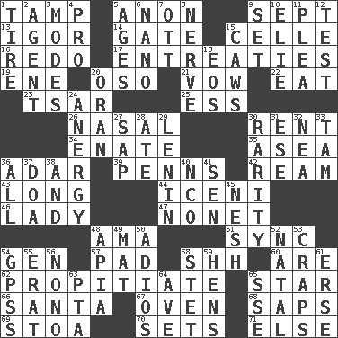 ACROSS 1. Pack (down) 5. Soon (poet.) 9. Back-to-school mo. 13. Composer Stravinsky 14. Yard entry 15. Cell (Danish) 16. Redecorate 17. Pleas 19. Compass dir. 20. Bear (Spanish) 21. Promise 22. Consume 23. Russian ruler of old 25. Double-curved letter 26. Rhinal 30. Monthly bill 34. Maternal 35. Toward the sea 36. The sixth month of the Jewish calendar 39. Actor Sean's family 42. 480, 500 or 516 sheets of paper 43. Protracted 44. Ancient Celtic tribe of eastern Britain 46. Kenny Rogers chart-topper in '80 47. Music written for nine 48. Nanny (var.) 51. Synchronize (abbr.) 54. Commissioned military rank (abbr.) 57. Groovy apt. 58. Quiet! 60. "We ___ not amused" (Victoria) 62. Conciliate 65. Play the lead 66. Before Barbara or Clara 67. Baking chamber 68. Plant excrements 69. Portico 70. Puts into a specified state 71. Otherwise DOWN 1. Hoop that covers a wheel 2. Representative 3. Methods 4. Adept person 5. Eons 6. Billionth: prefix 7. Baseball player Mel 8. Impudent aggressiveness 9. Arrange properly for use 10. Writer Wiesel 11. Entreaty 12. Trial 15. Crow sounds 18. Greek goddess of the dawn 20. NW Algerian seaport 24. Disorder of the immune system 27. Plant excrement 28. Had dinner 29. Soviet premier 1918-24 30. Noteworthy scarcity 31. Compass dir. 32. Teachers' org. 33. Scottish cap 36. Everything 37. ___ good deed 38. Also 40. Non-commissioned officer (abbr.) 41. Elected rep. 45. Delicate 48. Capital of Western Samoa 49. Floor protector 50. Goodbye (Sp.) 52. Brizilian seaport 53. Dice game 54. Global Positioning Systems (abbr.) 55. Part of Q.E.F. 56. Words to Nanette 58. Proofreading order 59. Coop moms 61. Celtic language 63. Parent Teacher Association (abbr.) 64. "___ Maria" 65. Compass dir.