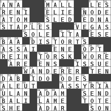 ACROSS 1. Santa ___, CA 4. Promenade 8. French article 11. Painter Guido (1575-1642) 13. Writer Wiesel 14. Connecting point 15. Tiny particle 16. Downhill vehicle 17. Pulitzer Prize-winning author Ferber 18. Paper fasteners 21. Viva Las _ 22. Flatfish 23. Call ___ day 25. Compass dir. 26. Sound made by sheep 29. What propaganda does 32. Slender Brazilian palm 34. Compass dir. 35. Choose 38. It's straight from the horse's mouth 39. Cod relative 41. Had on 43. "We ___ not amused" (Victoria) 44. Followers of ems 45. Come out of 46. Nomad 50. Nine, plus one 51. Pat or tap gently 54. Wedding promise 55. Lyric poems 57. Native American of Southwest Alaska 59. Nineveh was its capital 63. ____ Bator, Mongolia 64. First of billions? 67. Transmit 68. Indonesian resort city 69. Unable to walk 70. Carryall 71. A female animal or person 72. The sixth month of the Jewish calendar 73. Boy, to dad DOWN 1. Ancient river in northeast Turkey 2. Remaining after all deductions 3. Small Philippine buffalo 4. Makes clutter 5. 100% 6. Falsehood 7. Directed 8. Cabin 9. Ferber et al. 10. Gospel singer Marvin 12. Naughty children 14. Born 19. Farming town in central California 20. Biblical high priest 21. Large container 23. Charged atoms 24. Long journey 26. Long, evenly shaped piece 27. At sea 28. SW Saudi Arabia district 30. Laconic 31. Sty mamas 33. Afresh 36. Mail 37. Loyal 39. Look after 40. Southwest Nigerian state 42. Car or cant ending 45. Angers 47. Small island 48. Wanderer 49. Begley and Asner 51. Applies to a surface 52. Assad's deity 53. Memphis, Tenn. Street 56. System (abbr.) 58. Single; one (prefix) 60. Vintage cars 61. To the inside or interior of 62. An important port of Yemen 64. Chicken ___ king 65. June honoree 66. Wet nurse (var.)