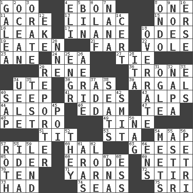 ACROSS 1. Thick or sticky substance 4. Inky black, to poets 8. Single 11. Measure of real estate 13. Pale purple color 15. Not either 16. Path through which fluid escapes 17. Lacking in sense or substance 18. Lyric poems 19. Ingested 21. Distant 22. Short-tailed, large-bodied rat 23. A saturated hydrocarbon 24. Teachers' org. 27. Neckwear 29. French philosopher Descartes 30. Marketplace scale 34. Shoshoni 36. Pate de foie ____ 39. Therefore, facetiously 40. Ooze 41. Amusement-park features 43. High mountains 44. Columnist Joseph or Stewart 46. Dutch treat 47. Beverage made from leaves 48. Stone: prefix 49. Prong on a fork 51. Teat (slang) 53. R.R. building 54. Atlas unit 57. Cause heat under the collar 60. Actor Linden 63. Honkers 65. River in Europe 66. Wear away 69. Remaining after all deductions 70. Nine, plus one 71. Tall tales 72. Tumult 73. Possessed 74. Oceans 75. Indian title of respect (Mr.) DOWN 1. An organ shaped like a helmet 2. Sea 3. Speak pompously 4. Connecticut Ivy Leaguer 5. Storage container 6. Norwegian king 7. Nanny 8. Southwest Nigerian state 9. Christmas carol 10. Celtic language 12. Make supply last 14. Certainty 18. Make much ado about nothing 20. Compass dir. 25. Engineer (abbr.) 26. Nest on high 28. Call ___ day 29. Newsperson 31. Stare at amorously 32. California wine valley 33. Raised railways 34. Ubangi River tributary 35. Trial 37. Increase 38. Theater features 40. Plant excrement 42. Stricken, poetically 45. Luau course 50. Tired old horse 52. Those people 54. Confronts 55. Having gotten out of bed 56. _ dish (used to culture cells) 57. Writer of Portnoy's Complaint (1969) 58. It may be bright or harebrained 59. Grant temporary use of 61. Ancient river in northeast Turkey 62. Old wives' tales, e.g. 64. Followers of ems 67. Heredity factor (abbr.) 68. Double-curved letter