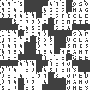 ACROSS 1. Pismires 5. "We ___ not amused" (Victoria) 8. Bear (Spanish) 11. Anneal 12. Eons 13. Tired old horse 14. Kingdom 17. One of the two male reproductive glands 19. Disco prop 21. Cigar-shaped 22. Comfort 23. Ocean 24. Mouth edge 27. Be inclined (to) 29. Plant excrement 32. Join together 34. Distress signal 36. Southern CA. univ. 37. Nanny 38. Choose 39. Indian titles of respect 40. Afresh 41. Teachers' org. 42. Intended 43. Marina Del _, California 44. Cause heat under the collar 46. Unit of force equal to gravity 47. Nanny (var.) 50. San ____ (Riviera town) 52. Spoke pompously 55. Michaelmas daisies 57. Conveyance 59. Had an oblique or slanted direction 62. Heredity factor (abbr.) 63. Round or rotation of duties 64. Billionth: prefix 65. Title for a knight 66. Eastern Standard Time (abbr.) 67. Washington bills DOWN 1. Plus 2. Modern: prefix 3. Scottish caps 4. Schedule 5. Mature 6. Musical pauses 7. First name in cosmetics 8. At one time in the past 9. Table seasoning 10. Double curve, resembling the letter S 12. Had dinner 15. Feeling or showing extreme anger 16. Characteristic smell of wine 18. Lyricist Gershwin 20. Gillaume's butler role 24. Type of eclipse 25. Lacking in sense or substance 26. Abounding in pines 28. Drug addict 29. Lean end of the neck 30. Place in a line 31. Thick mixture 33. The 23rd letter of the Hebrew alphabet 35. Flight of steps 36. Purpose 42. Klaipeda city 45. Allows 47. _ moment's notice (2 wds.) 48. Distance measurement (Brit.) 49. Goodbye (Sp.) 51. U. of Maine site 52. Likelihood 53. Painter Guido (1575-1642) 54. Having or resembling wings 55. Santa ___, CA 56. Connect, as a bridge 58. Baseball player Mel 60. Compass dir. 61. Two (Sp.)