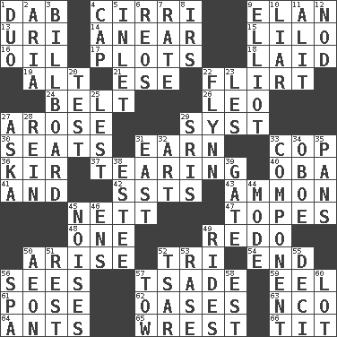 ACROSS 1. Small moist lump or mass 4. High-altitude cloud 9. Liveliness 13. RI univ. 14. Approach 15. _ and Stitch 16. Lubricate 17. Ground plans 18. Put down 19. Keyboard modifier key 21. Compass dir. 22. Seductive woman who exploits men 24. Waist strap 26. Lion 27. Came up 29. System (abbr.) 30. Theater features 31. Merit 33. Police officer (slang) 36. Apertif with cassis 37. Separating forcefully 40. Chief or king in Benin or Nigeria 41. Also 42. Fast planes 43. ID or VA city 45. Remaining after all deductions 47. Drinks excessively 48. Single 49. Redecorate 50. Originate 52. Three (prefix) 54. Conclude 56. Perceives with the eye 57. Sadhe (variant) 59. Snakelike fish 61. Introduce or present, as a question 62. Fertile tracts in a desert 63. Non-commissioned officer (abbr.) 64. Pismires 65. Take or capture by force 66. Teat (slang) DOWN 1. Superhero pair 2. Roberta Peters solo 3. Big road sign 4. Head covering 5. An arm off of a larger body of water 6. Vintage cars 7. Assign a rank or rating to 8. Big collection agency 9. American author Paul (1891-1958) 10. One who doesn't tell the truth 11. Set down 12. Allow head to fall sleepily 20. Trial 22. Film actor Errol 23. French article 25. For fear that 27. "____ silly question..." 28. It's straight from the horse's mouth 29. Indian titles of respect 31. 90 degrees 32. Tate display 33. Part 34. Mitch Miller's instrument 35. Baking dishes 38. First name in cosmetics 39. Yard entry 44. Method 45. Annoying sounds 46. Followers of ems 49. Amusement-park features 50. Age 51. Relief 52. Russian ruler of old 53. Raze (variant) 55. Tenth: prefix 56. Health resort 57. Pull behind 58. Eastern Standard Time (abbr.) 60. Car dealer's back yard