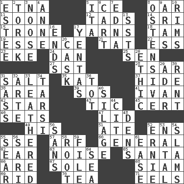 ACROSS 1. Inactive volcano in Sicily 5. Frozen water 8. Boat paddle 11. Within a short period 12. Bits 14. _ Lanka 15. Marketplace scale 17. Tall tales 18. Scottish cap 19. Core 21. Make lace 22. Curvy letter 23. Supplement with great effort 24. One of the 12 tribes of Israel 25. Elected rep. 27. Fast jet (abbr.) 28. Russian ruler of old 31. Table seasoning 35. Krazy ___ of comics 37. Flintstone garb 38. Length times width 39. Distress signal 41. "Terrible" tsar 42. Play the lead 43. Nervous spasm 45. Sure thing 46. Puts into a specified state 47. Hat (slang) 49. Part of HMS, perhaps 51. Had dinner 52. Followers of ems 55. Compass dir. 57. Sandy's bark 60. Commissioned military rank 62. Ewer handle 63. Annoying sound 65. Before Barbara or Clara 66. "We ___ not amused" (Victoria) 67. Not divided or shared with others 68. Thailand, formerly 69. To free from 70. Afternoon social gathering 71. Snakelike fish DOWN 1. First name in cosmetics 2. Cod relative 3. Trap for birds or small mammals 4. Queen of England 1702-14 5. Call ___ day 6. Haul 7. Pulitzer Prize-winning author Ferber 8. Clearly or manifestly demonstrative 9. Ancient river in northeast Turkey 10. Basketball hoops 13. Fast planes 16. Extremities 17. Gossips 20. Keg 26. Principle of right and wrong 29. The sixth month of the Jewish calendar 30. Monthly bill 31. Backtalk 32. Johnson of "Laugh-In" 33. Tough but pliablecoriaceous 34. Tarsus (plural) 36. Small child 40. Fodder prepared in a silo 44. Quote 48. Hiding places for outlaws 50. Without 52. Bert's buddy 53. Relating to or accompanying birth 54. Hits or strikes with great force 55. Singe 56. Indian skirt 58. Carrot, for example 59. Do some clerical work 61. Comfort 64. Ocean