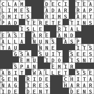 ACROSS 1. Dollar (slang) 5. Tenth: prefix 9. Afternoon social gathering 12. Citrus fruits 14. The sixth month of the Jewish calendar 15. Reproach for some lapse or misdeed 16. Leaves out 17. Basketball hoops 18. Tate display 19. Groovy apt. 20. Cylindrical with tapered ends 23. Metal containers 24. Capri or Wright 25. Monetary unit of Yemen 27. Compass direction 30. "We ___ not amused" (Victoria) 32. Plus 33. Silent film actress Nazimova 34. Religious women 36. Viper 38. The 19th letter of the Greek alphabet 39. Compass dir. 40. It is 43. Girls' org. (abbr.) 46. Set or collection 48. Observes 49. Australian flightless bird 51. Wedding promise 52. Is not 53. Connect, as a bridge 54. Arab leader 56. "This won't hurt ____!" 58. Place for singles 61. Compass dir. 64. Commissioned mil. rank 65. Travel on or in a vehicle 66. Riviera of "Kiss of the Spider Woman" 68. Tired old horse 69. Angers 70. Ethiopian city, capital of Harari 71. Binary compound 72. Incision 73. Lairs DOWN 1. Hoof sound 2. Pale green bean 3. Among 4. Was introduced to 5. Have the gumption 6. Prepare for publication 7. Device for capturing images 8. Big collection agency 9. Hang back 10. Merit 11. Flats, for short 13. Fast planes 21. Liveliness 22. Summer TV shows 23. Small boys 24. Call ___ day 26. _ tizzy (2 wds.) 27. Consume 28. Wing 29. Snaillike creature with no shell 31. World-weariness 35. Beer mug 37. Sliced desserts 41. Nine, plus one 42. Fast jet (abbr.) 44. Back-to-school mo. 45. Nanny (var.) 47. Heavy book 48. Title for a knight 50. Undo the wiring of 53. Burn superficially 55. Hankering 56. Hindu god of fire 57. Necklace unit 59. An important port of Yemen 60. For fear that 61. Beget 62. Comedian Laurel of Laurel & Hardy 63. Hearing organs 65. To free from 67. Possessed