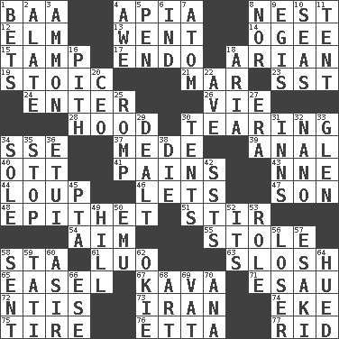 ACROSS 1. Sound made by sheep 4. Capital of Western Samoa 8. A home for chicks 12. Shade tree 13. Gone 14. Double curve, resembling the letter S 15. Pack (down) 17. Inside; within (prefix) 18. Believer in; advocate of (suffix) 19. Unemotional 21. Impair 23. Fast jet (abbr.) 24. Keyboard key 26. Compete 28. Parka part 30. Separating forcefully 34. Compass dir. 37. Ancient Persian 39. Of or related to the anus 40. Baseball player Mel 41. Aches 43. Compass dir. 44. Central Nebraska county 46. Allows 47. Manchild 48. Curse 51. Move through with a circular motion 54. Direct toward a target or goal 55. Fur scarf 58. R.R. building 61. Nilotic language 63. Make a splashing sound 65. Artist's stand 67. Polynesian shrub of the pepper family 71. Son of Isaac 72. Nuclear Threat Initiatives 73. SW Asia republic 74. Supplement with great effort 75. Hoop that covers a wheel 76. Singer James 77. To free from DOWN 1. Wagers 2. Having winglike extensions 3. ID or VA city 4. Deep reverence 5. Fenced enclosure 6. Indiana (abbr.) 7. Smallest unit of an element 8. Not either 9. Armor plate that protects the chest 10. Oceans 11. Portable shelter 16. Heart or essence 18. Roberta Peters solo 20. Corporate head (abbr.) 22. "___ Maria" 25. Frolic 27. Epoch 29. Started a card game 30. Portable shelters 31. Restaurants 32. Billionth: prefix 33. Small, secluded valley 34. Flatfish 35. Cease 36. Needle case 38. Pass on 42. Fast planes 45. Parent Teacher Assoc. 49. Land elevation 50. Australian flightless bird 52. ___ a Wonderful Life 53. Hero or heavy, e.g. 56. Failure 57. 1973 Nobel Price Winner (Physics) Leo 58. Posted 59. Jacques of French films 60. SW Saudi Arabia district 62. Migrant worker of the '30s 64. Took on color 66. Compass dir. 68. Nonscientific branch of learning 69. Large container 70. Santa ___, CA