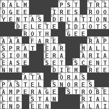 ACROSS 1. Lip ointment 5. Pacific Standard Time (abbr.) 8. Three (prefix) 11. Double curve, resembling the letter S 12. Angers 13. Friend of Pooh 14. Gossips 17. Accusation by an informer 19. Erase 21. Foolish or stupid persons 22. Writer of Portnoy's Complaint (1969) 23. Unit of force equal to gravity 24. Auto club (abbr.) 27. Conductor's collection 29. Strike 32. Small fatty European fish 34. Hearing organ 36. Shopping center 37. The Jewish people; Israel 38. Period 39. Operatic vocal solo 40. Relaxation 41. Put into a specified state 42. Odor 43. Compass dir. 44. South Vietnam president (1954) 46. To separate or throw off 47. "One Day ___ Time" 50. Mouths or openings 52. Soft color 55. Sounds asleep 57. Electrical Measurement 59. Disco prop 62. Area sheltered from the wind 63. Comedian Laurel of Laurel & Hardy 64. Monetary unit of Yemen 65. Conclusion 66. Car or cant ending 67. Jai ____ DOWN 1. Male child 2. Ripen 3. Grant temporary use of 4. Distance measurement 5. Before (prefix) 6. Major League Baseball Commissioner Bud 7. Sadhe (variant) 8. Musical group of three 9. Carrot, for example 10. Charged atoms 12. Binary compound 15. At or to great height 16. Bristle 18. Make a knot 20. Threesomes 24. NE Netherlands city 25. Bee-related 26. Came up 28. Having ears or earlike features 29. More uncommon 30. Place in a line 31. Food holder 33. A saturated hydrocarbon 35. Food allowance for one day 36. Big _ 42. Don Adams' spy role 45. Greek god of love 47. Had dinner 48. Laconic 49. Having winglike extensions 51. Spanish missionary in California 52. Light colored 53. So be it 54. Broke a traffic law 55. Elected rep. 56. Earth 58. Separate the seeds from cotton 60. Sound made by sheep 61. Connecticut Ivy Leaguer
