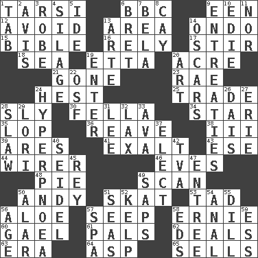 ACROSS 1. Tarsus (plural) 6. English channel? 9. Car or cant ending 12. Prevent the occurrence of 13. Length times width 14. Southwest Nigerian state 15. Instruction Manual for Humans 16. Have confidence or faith in 17. Agitate 18. Ocean 19. Singer James 20. 43,560 square feet 21. Went 23. Actress Charlotte 24. Command 25. Exchange 28. Insidious 30. Chap (slang) 34. Play the lead 35. Trim (branches) 36. Break or tear apart 38. One more than two 39. Ancient Greek god of war 41. Honor 43. Compass dir. 44. One who wires 46. Nights before holidays 48. Sliced dessert 49. Glance over 50. "60 Minutes" Commentator Rooney 51. Three-handed card game 53. Bit 56. Medicinal plant 57. Ooze 58. Bert's buddy 60. Highlander 61. Friends 62. Allots cards 63. Period 64. Viper 65. Exchanges for money DOWN 1. Bar bill 2. Advice 3. Loose flowing garment 4. Fodder prepared in a silo 5. Binary compound 6. Cy Young winner Saberhagen 7. Actor Lugosi 8. Island 9. Pleas 10. Singer Brickell 11. And not 13. Johnson of "Laugh-In" 14. Motion picture awards 19. Keyboard key 20. Nonscientific branch of learning 22. Order of Saint Francis (abbr.) 24. Abnormally rapid or deep breathing 26. Raised platform 27. 4th largest of the Great Lakes 28. Cole _ (cabbage dish) 29. Australian parrot (variant) 31. Area sheltered from the wind 32. Not strict 33. Actress Gardner 37. Opt 40. Beer mug 42. Federal power corp. 45. Marina Del _, California 47. Main course 49. Plant excrements 50. Having or resembling wings 51. Oceans 52. Seaweed 54. Of or related to the anus 55. Deli pickle 56. Grow older 57. Health resort 58. Begley and Asner 59. Double-curved letter