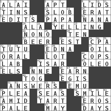 ACROSS 1. Jai ____ 5. Fitting 8. Hats (slang) 12. Metal containers 13. Messy guy 15. Part of Q.E.F. 16. Prepares for publication 18. Dad 19. Nanny 20. According to 22. Crying or shouting loudly 24. Words to Nanette 26. "___ Little Indians" 27. Fermented drink made from hops 28. Eastern Standard Time (abbr.) 29. Accounting whiz (abbr.) 32. Ballerina skirt 35. Pulitzer Prize-winning author Ferber 37. Lubricate 38. Spoken 39. Car dealer's back yard 40. 911 reaches them 41. Experiment locale 42. Austrian river, tributary to the Danube 43. Margarine 44. Raised railways 45. Compass dir. 46. Merit 49. Coat; cloak 50. Armor plate that protects the chest 51. Replies 55. Australian flightless bird 56. Entreaty 57. Oceans 59. Grin 63. Among 64. Small pie 65. Greek god of love 66. Light colored 67. Fifth month 68. 24-hour periods DOWN 1. Had dinner 2. Hat (slang) 3. Black tropical American cuckoo 4. Byzantium, centuries later 5. Cleo's killer 6. Frolic 7. Drink excessively 8. Soviet premier 1918-24 9. SW Asia republic 10. Mild oath, euphamism for damn 11. R.R. building 14. Greek mezzo-soprano Agnes 17. _ gin 21. A saturated hydrocarbon 23. Allow 25. Threatening words 28. Main course 29. Calm and collected 30. Corncob 31. In addition 32. Lacquered or enameled metalware 33. Mountain range 34. Bar bills 36. ___ good deed 40. Ingested 42. Consume 45. At this time 47. Grow older 48. Basketball hoops 49. Sadhe (variant) 51. _ mater 52. Famous astronaut Armstrong 53. 480, 500 or 516 sheets of paper 54. "Two Mules for Sister ____" 56. Infant food 58. Filthy place 60. Retirement account (abbr.) 61. Myrna of the movies 62. Curvy letter