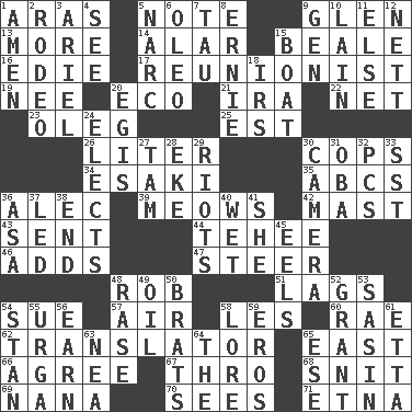 ACROSS 1. Caspian sea tributary 5. Make mention of 9. Small, secluded valley 13. Greater amount 14. Having or resembling wings 15. Calif. Air Force Base 16. Singer Brickell 17. One who advocates reunion 19. Born 20. Environmental prefix 21. Retirement account (abbr.) 22. Fish or hair follower 23. Cassini of fashion 25. Eastern Standard Time (abbr.) 26. 61 cubic inches 30. 911 reaches them 34. 1973 Nobel Price Winner (Physics) Leo 35. Lettered men learn these first 36. Actor Baldwin 39. Catcalls? 42. Vertical spar for supporting sails 43. Transmitted 44. Giggle 46. Does sums 47. Guide 48. Director Reiner 51. Falls behind 54. Institute legal proceedings 57. Wind 58. French article 60. Actress Charlotte 62. Interpreter 65. Compass direction 66. Match 67. Through, poetically 68. In a ____ (agitated or irritated) 69. Nanny 70. Perceives with the eye 71. Inactive volcano in Sicily DOWN 1. So be it 2. Cowboy competition 3. Satellite of Uranus 4. Observe 5. Drug cop 6. Margarine 7. The 19th letter of the Greek alphabet 8. Bert's buddy 9. Commissioned mil. rank 10. (Had) reclined 11. Otherwise 12. Remaining after all deductions 15. Water vessel 18. Big collection agency 20. Armor plate that protects the chest 24. Chooses 27. Scottish cap 28. Supplement with great effort 29. Disturbances 30. Device for capturing images 31. Chief or king in Benin or Nigeria 32. Personal Computers (abbr.) 33. Fast jet (abbr.) 36. White ___ sheet 37. Directed 38. Conclusion 40. Soggy 41. A female animal or person 45. Snakelike fish 48. Raze (variant) 49. Petroleum 50. Naughty children 52. Let have 53. Indian antelope 54. Comedian Laurel of Laurel & Hardy 55. Capital and largest city of Mongolia 56. Merit 58. Old wives' tales, e.g. 59. Greek god of love 61. Singer James 63. Teachers' org. 64. Definite Article 65. Compass dir.