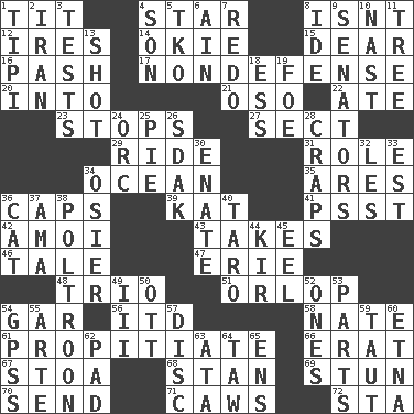 ACROSS 1. Teat (slang) 4. Play the lead 8. Is not 12. Angers 14. Migrant worker of the '30s 15. Letter starter 16. Romantic infatuation 17. Unrelated to defense, as in spending 20. To the inside or interior of 21. Bear (Spanish) 22. Had dinner 23. Constricts 27. Religious group 29. Travel on or in a vehicle 31. Hero or heavy, e.g. 34. Sea 35. Ancient Greek god of war 36. Smile enhancers 39. Krazy ___ of comics 41. Inconspicuous attention getter 42. Mine, in Marseilles 43. Proceeds 46. Lie 47. 4th largest of the Great Lakes 48. Musical group of three 51. Fourth or lowest deck 54. Slender fish 56. It would 58. Nathan's nickname 61. Appease 66. Part of Q.E.F. 67. Portico 68. Comedian Laurel of Laurel & Hardy 69. Surprise greatly 70. Transmit 71. Crow sounds 72. R.R. building DOWN 1. Native american tent (variation) 2. SW Asia republic 3. Trials 4. Male child 5. Ring climax 6. The 18th letter of the Arabic alphabet 7. Redecorate 8. Binary compound 9. Legislators 10. Political cartoonist Thomas 11. Family _ (genealogy) 13. Attempt 18. Double-curved letter 19. Enemy 24. The grampus (Milton) 25. Sliced dessert 26. Neighbor of Neb. 28. Dice game 30. Maternal 32. French article 33. Eastern Standard Time (abbr.) 34. Flexible twig of a willow tree 36. Feline 37. Wet nurse (var.) 38. Coward 40. Pacific island yam 44. Apertif with cassis 45. Snakelike fish 49. One more than two 50. Baseball player Mel 52. Singles 53. Actors' quests 54. Global Positioning Systems (abbr.) 55. Johnson of "Laugh-In" 57. Plate 59. Pulled tight 60. Inactive volcano in Sicily 62. Groovy apt. 63. "One Day ___ Time" 64. The 23rd letter of the Hebrew alphabet 65. Followers of ems