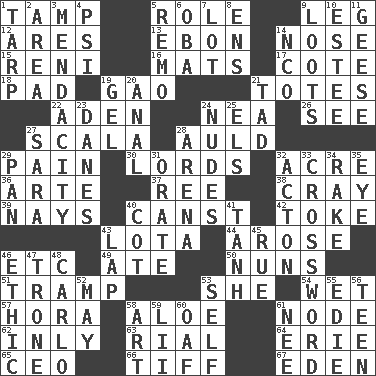 ACROSS 1. Pack (down) 5. Hero or heavy, e.g. 9. Part of a journey 12. Ancient Greek god of war 13. Inky black, to poets 14. Characteristic smell of wine 15. Painter Guido (1575-1642) 16. Floor coverings 17. ____ d'Azur (French Riviera) 18. Writing tablet 19. E Mali city 21. Hauls 22. Arabian gulf 24. Teachers' org. 26. Observe 27. Any of the three canals of the cochlea 28. Old (Scot.) 29. Ache 30. Titled peers of a realm 32. Measure of real estate 36. Johnson of "Laugh-In" 37. To riddle 38. Supercomputer manufacturer 39. Negative votes 40. 2nd pers. sing. pres. of can (arch.) 42. Casino tip 43. Globular water bottle used in Asia 44. Came up 46. And so on (abbr.) 49. Had dinner 50. Religious women 51. _____ steamer (cargo ship) 53. A female animal or person 54. Soggy 57. Israeli folk dance 58. Medicinal plant 61. Connecting point 62. In an inward manner 63. Monetary unit of Yemen 64. 4th largest of the Great Lakes 65. Corporate head (abbr.) 66. Small quarrel 67. Locale of original sin DOWN 1. Canvas cover 2. Length times width 3. Ananias' fault 4. Air pressure measure (abbr.) 5. San ____ (Riviera town) 6. Chief or king in Benin or Nigeria 7. Car dealer's back yard 8. Followers of ems 9. Plunders 10. First name in cosmetics 11. Honkers 14. Non-commissioned officer (abbr.) 19. Set 20. Of or related to the anus 21. Small amount or degree 23. Natives or inhabitants of Denmark 24. Unadorned figures 25. Raised railways 27. "Two Mules for Sister ____" 28. Sports stadium 29. Baking dish 31. Declaim 32. 13-14th century defensive garment 33. What you're doing now 34. Libertine 35. Sight organ 40. Small bed 41. Hyperbolic tangent 43. Pet locale 45. Sorrow 46. Principle of right and wrong 47. Heavy duty weighing machine 48. Monte _, Las Vegas Hotel/Casino 52. Can I? 53. Automatically 55. Singer Brickell 56. Adolescent 58. Tate display 59. Cards in a Roman deck? 60. Clumsy lout 61. Born