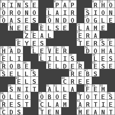 ACROSS 1. Remove soap 6. Infant food 9. 17th letter of the Greek alphabet 12. U. of Maine site 13. Den 14. The Jewish people; Israel 15. Fertile tracts in a desert 16. Southwest Nigerian state 17. Stare at amorously 18. Born 19. Otherwise 20. Unable to walk 21. Ardor 23. Epoch 24. Sight organs 25. Laconic 28. Possessed 30. Crowbar 34. Capital of the state of Qatar 35. Biblical high priest 36. Ms. Damita and namesakes 38. French article 39. Loose flowing garment 41. A person who is older than you are 43. Compass dir. 44. Makes a sale 46. Confederate soldiers (slang) 48. Raised railways 49. Algonquian 50. In a ____ (agitated or irritated) 51. Silent film actress Nazimova 53. Opposite of masc. 56. Margarine 57. Mitch Miller's instrument 58. Lugs 60. Remainder 61. Dollar (slang) 62. Nick name for Arthur 63. Music discs 64. "___ Little Indians" 65. Intended DOWN 1. Friend of Pooh 2. SW Asia republic 3. Sense of smell 4. Dwarf with a sinus problem 5. Greek goddess of the dawn 6. Zero-star reviews 7. Assistant 8. Adept person 9. Complicated, petty procedures 10. Opening into or through something 11. Single 13. Hang loosely or laxly 14. Flew 19. Artist's stand 20. Allow 22. Snakelike fish 24. The property of being fit to eat 26. "______ My Girl" (Turtles hit) 27. Comfort 28. Possessive pronoun 29. Medicinal plant 31. Compete 32. Pipe bend 33. To free from 37. Spanish missionary in California 40. American author Paul (1891-1958) 42. To sift 45. Fast jet (abbr.) 47. Prior to 49. Clement's nick name 50. Downhill vehicle 51. Competent 52. Grant temporary use of 54. Singer James 55. Count _ (2 wds.) 56. The grampus (Milton) 57. Sep. follower 58. Scottish cap 59. Arrange properly for use
