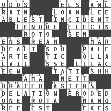 ACROSS 1. Likelihood 5. Raised railways 8. Leather borer 11. Precipitation 12. Rich soil 13. Area sheltered from the wind 14. Most capable 17. Happening 19. Poe poem 21. Opts 22. Printing process, for short 23. Elected rep. 24. Followers of ems 27. 480, 500 or 516 sheets of paper 29. Spoil 32. Started a card game 34. "Barney Miller" actor Jack 36. Diluted with white 37. Johnson of "Laugh-In" 38. Nervous spasm 39. Rounded earthenware pot or jar 40. 57 in ancient Rome 41. Compass dir. 42. Pale purple color 43. Car or cant ending 44. Jacques of French films 46. Quiet! 47. Housemaid (var.) 50. Remaining after all deductions 52. Declaimed 55. Michaelmas daisies 57. Conveyance 59. Eaten away 62. Single 63. Round or rotation of duties 64. Billionth: prefix 65. Portuguese money of account (variant) 66. Eastern Standard Time (abbr.) 67. Supplements with great effort DOWN 1. Mouth or opening 2. Pat or tap gently 3. Deli pickle 4. Contemptuous expression 5. A really long time 6. Shoestrings 7. Grin 8. Actor Baldwin 9. Left 10. Allows 12. Falsehood 15. Derisive sound 16. Lug 18. Lair 20. Exposes to great heat 24. Peak District village in England 25. Impudent aggressiveness 26. Smooth fabric 28. Damp 29. Shopping centers 30. Assad's deity 31. Arrive at 33. Flowery wreath 35. Seas 36. Luau course 42. 61 cubic inches 45. False hair 47. "One Day ___ Time" 48. Distance measurement (Brit.) 49. Goodbye (Sp.) 51. Heavy duty weighing machine 52. Scent 53. French philosopher Descartes 54. Toward shelter 55. Santa ___, CA 56. Neighbor of Neb. 58. Baseball player Mel 60. Compass dir. 61. Two (Sp.)