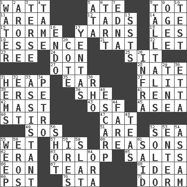 ACROSS 1. Electrical Unit 5. Had dinner 8. Small child 11. Type of rug 12. Bits 14. Grow older 15. Singer Mel 17. Tall tales 18. French article 19. Core 21. Make lace 22. Allow 23. To sift 24. Spanish title 25. Be seated 27. Baseball player Mel 28. Nathan's nickname 31. Pile 35. Ewer handle 37. Secret move to avoid paying debts 38. Celtic language 39. A female animal or person 41. Monthly bill 42. Vertical spar for supporting sails 43. Order of Saint Francis (abbr.) 45. At sea 46. Agitate 47. Domesticated feline 49. Distress signal 51. "We ___ not amused" (Victoria) 52. Ocean 55. Dripping 57. Part of HMS, perhaps 60. Thinks logically 62. Period 63. Lowest deck of a ship 65. Table seasonings 66. Age 67. Lacerate 68. The content of cognition 69. Pacific Standard Time (abbr.) 70. R.R. building 71. Dormintory (informal) DOWN 1. Wetness 2. Came up 3. Laconic 4. Not wild 5. "One Day ___ Time" 6. Small pie 7. Pulitzer Prize-winning author Ferber 8. Baron Munchausen's specialties 9. Double curve, resembling the letter S 10. Trial 13. Fast planes 16. Inside; within (prefix) 17. Gossips 20. ____ d'Azur (French Riviera) 26. Kind of red light 29. Prong on a fork 30. Singer James 31. Folds over and sews together 32. Part of Q.E.F. 33. Helper 34. Stone: prefix 36. 17th letter of the Greek alphabet 40. Fortification 44. Conductor's collection 48. Beverages made from leaves 50. Attempt 52. Twentieth part of a lira 53. Keyboard key 54. Indian state 55. Shed a tear 56. Greek god of love 58. Angers 59. Narrow board 61. Alleged 64. Mouth or opening