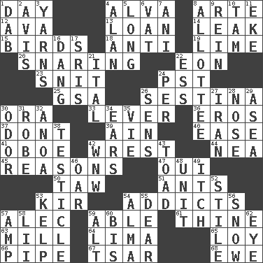 ACROSS 1. 24 hours 4. Inventor's middle name 8. Johnson of "Laugh-In" 12. Actress Gardner 13. Grant temporary use of 14. Path through which fluid escapes 15. Avian creatures 18. Against 19. Welles in "The Third Man" 20. Catching in a trap 22. Period of immesurable duration 23. In a ____ (agitated or irritated) 24. Pacific Standard Time (abbr.) 25. Girls' org. (abbr.) 26. French poetic form 30. Mouth or opening 33. Crowbar 36. Greek god of love 37. Do not 39. The 18th letter of the Arabic alphabet 40. Comfort 41. Mitch Miller's instrument 42. Take or capture by force 44. Teachers' org. 45. Thinks logically 47. Fr. "Yes" 50. The 23rd letter of the Hebrew alphabet 51. Pismires 53. Apertif with cassis 54. Inveterate users 57. Actor Baldwin 59. Competent 61. One or ones belonging to thee 63. Place where flour is made 64. Pale green bean 65. Myrna of the movies 66. Corncob 67. Russian ruler of old 68. She-sheep DOWN 1. Pat or tap gently 2. Deliberation 3. Tall tales 4. Actor Alda or Thicke 5. Having great length 6. Large container 7. Black tropical American cuckoo 8. One to whom something is allotted 9. It's straight from the horse's mouth 10. Scottish cap 11. Make supply last 16. Mild oath, euphamism for damn 17. Indian titles of respect 21. Slanted text style (abbr.) 22. Double-curved letter 24. For each 26. Elected reps. 27. SW Asia republic 28. Olfactory organ 29. Toward the sea 30. Aroma 31. Loose flowing garment 32. Small Philippine buffalo 34. Hearing organs 35. Compete 38. A testis 42. Compass dir. 43. Frog relative 46. Rowing implement 48. A single undivided whole 49. Hankering 52. Vertical member of a panel or frame 53. Seaweed 54. _ mater 55. Letter starter 56. Frozen precipitation 57. Electrical Unit 58. Cards in a Roman deck? 59. The first octave above the treble staff 60. Again 62. Sight organ
