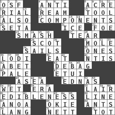 ACROSS 1. Order of Saint Francis (abbr.) 4. Against 8. 1/640 square mile 12. Monetary unit of Yemen 14. 480, 500 or 516 sheets of paper 15. Utensil 16. In addition 17. Parts 20. Stalk of a moss capsule 21. Frozen water 22. Enemy 23. Box-office sellout 27. Pull apart 29. Highlander 31. Undercover agent 34. Travel by water 35. Washington bills 36. Farming town in central California 39. Consume 41. Nuclear Threat Initiatives 42. Collude with 43. Debunk (Brit. slang) 46. Light colored 47. Needle case 48. At sea 51. Ferber et al. 54. Dripping 56. Period 58. Den 61. The property of being fit to eat 66. Actor's bit 67. Small Philippine buffalo 68. Migrant worker of the '30s 69. Pismires 70. Long (Scottish) 71. Remaining after all deductions 72. Small child DOWN 1. Mouths or openings 2. Filth; sediment 3. Goes without food and/or water 4. Curve 5. Modern: prefix 6. Scottish cap 7. Body of Kaffir warriors 8. Had dinner 9. Meet 10. Printing process, for short 11. Otherwise 13. Rich soil 18. Sep. follower 19. Born 24. White ___ sheet 25. _-fi 26. Hollow 28. Amid 30. Sadhe (variant) 32. Flowery wreath 33. Double-curved letter 34. Locates 36. Pet locale 37. Chief or king in Benin or Nigeria 38. Accusation by an informer 40. False hair 44. Partially opened flower 45. The 18th letter of the Arabic alphabet 49. Snakelike fish 50. "We ___ not amused" (Victoria) 52. Silent film actress Nazimova 53. Virtuous person 54. Welt 55. Pulitzer Prize-winning author Ferber 57. At once, immediately (arch.) 59. To the inside or interior of 60. Take ten 62. Paper or plastic container 63. Make supply last 64. Be seated 65. Put into a specified state