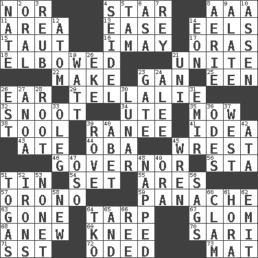 ACROSS 1. And not 4. Play the lead 8. American Automobile Association (abbr.) 11. Type of rug 13. Comfort 14. Snakelike fish 15. Strained 16. "If ____ say so..." 17. Mouths or openings 18. Turned at an angle; bent 21. Join together 22. Cause to be 23. Separate the seeds from cotton 25. Car or cant ending 26. Ewer handle 29. Copy Pinocchio 32. Snout, nose 34. Shoshoni 35. Cut the grass 38. Instrument 39. The wife of a rajah (variant) 41. It may be bright or harebrained 43. Had dinner 44. Chief or king in Benin or Nigeria 45. Obtain by seizing forcibly or violently 46. State head 50. R.R. building 51. Shallow baking pan 54. Put into a specified state 55. Ancient Greek god of war 57. U. of Maine site 59. Flamboyance 63. Went 64. Canvas cover 67. Seize upon or latch onto something 68. Afresh 69. Leg joint 70. Indian skirt 71. Fast jet (abbr.) 72. Wrote a lyric poem 73. Floor covering DOWN 1. Nathan's nickname 2. Taken by mouth 3. Reuben's nickname 4. A glass for beer 5. Scottish cap 6. White ___ sheet 7. Marina Del _, California 8. Nest on high 9. Having winglike extensions 10. NE Netherlands city 12. Tiny particle 14. Age 19. Electrical Unit 20. Make supply last 21. Corn or form start 23. Yard entry 24. Toward shelter 26. Eastern Standard Time (abbr.) 27. Small Philippine buffalo 28. Carrot, for example 30. Type of eclipse 31. Arab leader 33. Cassini of fashion 36. Lyric poems 37. 270 degrees 39. Be footloose 40. Collude with 42. _ moment's notice (2 wds.) 45. Songbird 47. Bear (Spanish) 48. Slept 49. Mouth or opening 51. Ancient Roman robes 52. Metal shackles 53. Music written for nine 56. Sinks 58. ___ Haven, CT 60. Dollar (slang) 61. Israeli folk dance 62. Send forth 64. Ring climax 65. Also 66. To sift