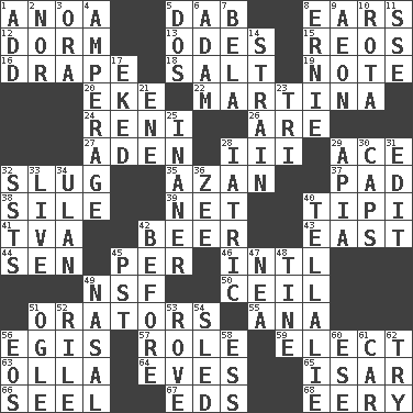 ACROSS 1. Small Philippine buffalo 5. Pat or tap gently 8. Hearing organs 12. Dormintory (informal) 13. Lyric poems 15. Vintage cars 16. Window treatment 18. Table seasoning 19. Brief written record 20. Supplement with great effort 22. Chrissie's court nemesis 24. Painter Guido (1575-1642) 26. "We ___ not amused" (Victoria) 27. Arabian gulf 28. One more than two 29. Adept person 32. Strike heavily 35. Muslim summons to prayer 37. Writing tablet 38. Filth; sediment 39. Fish or hair follower 40. Native american tent (variation) 41. Federal power corp. 42. Fermented drink made from hops 43. 90 degrees 44. Elected rep. 45. For each 46. International (abbr.) 49. Science/research agcy. 50. To provide with a ceiling 51. Speakers 55. Santa ___, CA 56. Armor plate that protects the chest 57. Hero or heavy, e.g. 59. Choose 63. Spanish pot 64. Nights before holidays 65. Austrian river, tributary to the Danube 66. Sew up the eyelids of hawks and falcons 67. Begley and Asner 68. Suggestive of the supernatural DOWN 1. Increase 2. And not 3. Mouth or opening 4. Electrical Measurement 5. Two (Sp.) 6. First of billions? 7. Actor Lugosi 8. Bert's buddy 9. Age 10. Roll call or roster of names 11. Compass dir. 14. Put through a sieve 17. Made supply last 21. Compass dir. 23. Three (prefix) 25. Sillier 28. Of or pertaining to medicine 29. Capital of Western Samoa 30. Balmoral and tarboosh 31. Prepare for publication 32. Fast planes 33. Moving, as bait 34. Uhlan (variant) 36. Last letter of the English alphabet 40. Copy Pinocchio 42. Prior to 45. Pacific Standard Time (abbr.) 47. Teachers' org. 48. Prong on a fork 49. Rhinal 51. Stare 52. Cause heat under the collar 53. Be footloose 54. Downhill vehicle 56. Greek goddess of the dawn 58. Curvy letter 60. Compass dir. 61. 4-wheeled motor vehicle 62. Attempt to accomplish something