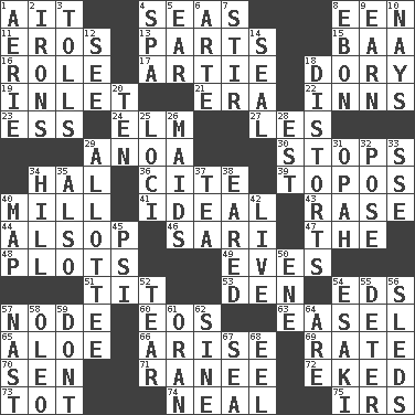 ACROSS 1. Small island 4. Oceans 8. Car or cant ending 11. Greek god of love 13. Actors' quests 15. Sound made by sheep 16. Hero or heavy, e.g. 17. Nick name for Arthur 18. Rowboat 19. An arm off of a larger body of water 21. Period 22. Lodging establishments 23. Curvy letter 24. Shade tree 27. French article 29. Small Philippine buffalo 30. Obstructs or blocks passage 34. Actor Linden 36. Quote 39. Traditional theme or motif 40. Place where flour is made 41. Standard of perfection 43. Raze (variant) 44. Columnist Joseph or Stewart 46. Indian skirt 47. Definite Article 48. Ground plans 49. Nights before holidays 51. Teat (slang) 53. Lair 54. Begley and Asner 57. Connecting point 60. Greek goddess of the dawn 63. Artist's stand 65. Medicinal plant 66. Originate 69. Pace 70. Elected rep. 71. Indian princess (variant) 72. Made supply last 73. Small child 74. Anneal 75. Big collection agency DOWN 1. Nest on high 2. Removes the wrinkles 3. For Whom the Bell _____ 4. Health resort 5. Hearing organ 6. Johnson of "Laugh-In" 7. Commotion 8. Inky black, to poets 9. Merit 10. Negative votes 12. Observe 14. Lick closed 18. What propaganda does 20. "___ Little Indians" 25. Venues 26. Women servants 28. Eastern Standard Time (abbr.) 29. One to whom something is allotted 31. Brightly colored fish 32. Introduce or present, as a question 33. Compass dir. 34. Land elevation 35. In addition 37. Afternoon social gathering 38. Having ears or earlike features 40. Atlas unit 42. Not recorded 45. Air pressure measure (abbr.) 50. Compass dir. 52. Pull apart 54. 1973 Nobel Price Winner (Physics) Leo 55. Prevent from occurring 56. Bobsleighs 57. Political cartoonist Thomas 58. Butter sub 59. Do not 61. NW Algerian seaport 62. Trig term 64. "We ___ not amused" (Victoria) 67. Ocean 68. Snakelike fish