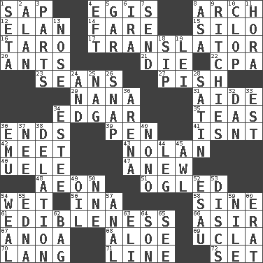ACROSS 1. Plant excrement 4. The front part of a cuirass 8. Bowlike part 12. Liveliness 14. Conductor's collection 15. Grain storage tower 16. Edible starchy tuberous root 17. Interpreter 20. Pismires 21. Expire 22. Numbers guy (abbr.) 23. Actors Connery and Penn 27. Expression of disdain 29. Nanny 31. Assistant 34. _ Allan Poe 35. Beverages made from leaves 36. Conclusions 39. Writing instrument 41. Is not 42. Confront 43. Pitcher Ryan 46. Ubangi River tributary 47. Afresh 48. Period of immesurable duration 51. Stared 54. Dripping 56. _ tizzy (2 wds.) 58. Trig term 61. The property of being fit to eat 66. SW Saudi Arabia district 67. Small Philippine buffalo 68. Medicinal plant 69. Southern CA. univ. 70. Long (Scottish) 71. Actor's bit 72. Put into a specified state DOWN 1. Stalk of a moss capsule 2. Actor Alda or Thicke 3. Components 4. Newt 5. Slender fish 6. Retirement account (abbr.) 7. Transmit 8. White ___ sheet 9. Actors Guy, Robert Welles, and Clint 10. Hoof sound 11. Israeli folk dance 13. Characteristic smell of wine 18. Small drink 19. Luau accessory 24. Also 25. Tired old horse 26. Fastener 28. Smooth fabric 30. Sports stadium 32. Daniel's nick name 33. Eastern Standard Time (abbr.) 34. First name in cosmetics 36. Australian flightless bird 37. Born 38. Conveyance 40. Words to Nanette 44. Part of a journey 45. Leather borer 49. Lubricate 50. Compass dir. 52. Son of Isaac 53. Plates 54. Welt 55. Pulitzer Prize-winning author Ferber 57. Of or related to the anus 59. Mediterranean tributary 60. Part of Q.E.F. 62. Paper or plastic container 63. Biblical high priest 64. Male child 65. Perceive with the eye