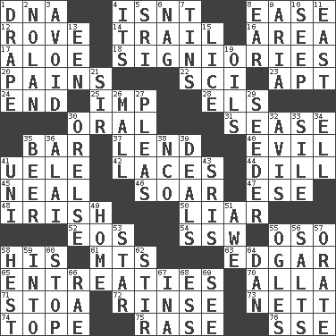 ACROSS 1. Heredity factor (abbr.) 4. Is not 8. Relaxation 12. Be footloose 14. Get behind 16. Length times width 17. _ vera 18. Seigniories (variant) 20. Aches 22. _-fi 23. Fitting 24. Conclusion 25. Naughty child 28. Raised railways 30. Of the mouth 31. Gospel singer Marvin 35. Oblong piece of solid material 37. Grant temporary use of 40. Tending to cause great harm 41. Ubangi River tributary 42. Shoestrings 44. Deli pickle 45. Anneal 46. Fly high 47. Compass dir. 48. From or relating to Ireland 50. One who doesn't tell the truth 52. Greek goddess of the dawn 54. Compass dir. 55. Bear (Spanish) 58. Part of HMS, perhaps 61. Mountains (abbr.) 63. _ Allan Poe 65. Pleas 70. Silent film actress Nazimova 71. Portico 72. Wash lightly 73. Remaining after all deductions 74. Drink excessively 75. To erase 76. Compass dir. DOWN 1. Window treatment 2. Pitcher Ryan 3. Stay clear from 4. ___ a Wonderful Life 5. _ Lanka 6. Tired old horse 7. Metal containers 8. Hearing organ 9. Roberta Peters solo 10. Ooze 11. Compass direction 13. Car or cant ending 15. Louse (plural) 19. Petroleums 21. Title for a knight 26. Shopping center 27. Entreaties 29. Sowing specialist 30. Threatening words 32. Deliberation 33. Filth; sediment 34. Pipe bend 35. Fermented drink made from hops 36. Mountain range southwest of Kyrgyzstan 38. Non-commissioned officer (abbr.) 39. Allots cards 41. Corn or form start 43. Indian titles of respect 49. Dwelling 51. Deep reverence 53. Play the lead 55. Stares 56. Table seasonings 57. Declaim 58. Behest 59. To the inside or interior of 60. Close up, plug up 62. Use a swizzle stick 64. One of the 12 tribes of Israel 66. Actress Charlotte 67. _ tizzy (2 wds.) 68. Curvy letter 69. Observe