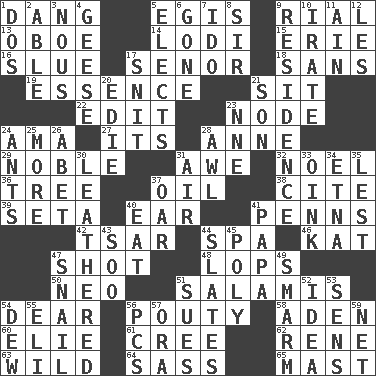 ACROSS 1. Mild oath, euphamism for damn 5. Armor plate that protects the chest 9. Monetary unit of Yemen 13. Mitch Miller's instrument 14. Farming town in central California 15. One of the Great Lakes 16. Change direction abruptly 17. Sir (Sp.) 18. Without 19. Gist 21. Be seated 22. Prepare for publication 23. Thickened enlargement 24. Wet nurse (var.) 27. It is 28. Singer Murray 29. Impressive in appearance 31. Deep reverence 32. Christmas carol 36. Relationship diagram 37. Petroleum 38. Quote 39. Bristle 40. Ewer handle 41. Actor Sean's family 42. Russian ruler of old 44. Health resort 46. Krazy ___ of comics 47. Guess 48. Chops off 50. Modern: prefix 51. Deli grouping 54. Letter starter 56. Marked by pouting 58. Arabian gulf 60. Writer Wiesel 61. Algonquian 62. French philosopher Descartes 63. Uncontrolled 64. Backtalk 65. Vertical spar for supporting sails DOWN 1. Two (Sp.) 2. Competent 3. Good sense 4. Honkers 5. Chooses 6. Went 7. Wedding promise 8. Title for a knight 9. Home 10. Feeling or showing extreme anger 11. The 18th letter of the Arabic alphabet 12. French article 17. In a ____ (agitated or irritated) 20. Singer Brickell 21. Male offspring 23. Compass dir. 24. Pismires 25. Greater amount 26. Collude with 28. Leather borer 30. Resembling or made to resemble leather 31. Wind 33. Pig sound 34. Inactive volcano in Sicily 35. For fear that 37. Rowing implement 40. Erode 41. Dad 43. "Barney Miller" actor Jack 44. Chalkboards 45. More than one (prefix) 47. Slow-paced one 49. Excessive but superficial compliments 51. Takes to court 52. The main thing one is thinking about 53. Elected reps. 54. Morning condensation 55. Biblical high priest 56. Personal Computers (abbr.) 57. Mouth or opening 59. Fish or hair follower