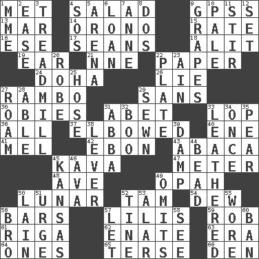 ACROSS 1. Was introduced to 4. First course 9. Global Positioning Systems (abbr.) 13. Impair 14. U. of Maine site 15. Assign a rank or rating to 16. Compass dir. 17. Actors Connery and Penn 18. Set down 19. Hearing organ 21. Compass dir. 22. Some stationery 24. Capital of the state of Qatar 26. Falsehood 27. Role for Stallone 29. Without 30. Off-Broadway awards 31. Collude with 33. Trim (branches) 36. Everything 37. Turned at an angle; bent 40. Compass dir. 41. Cartoonist voice _ Blanc 42. Inky black, to poets 43. Phillipine bananalike plant 45. Polynesian shrub of the pepper family 47. Distance measurement 48. "___ Maria" 49. Brightly colored fish 50. Type of eclipse 52. Scottish cap 54. Morning condensation 56. Taverns 57. Ms. Damita and namesakes 59. Director Reiner 61. Port city in Latvia 62. Maternal 63. Epoch 64. Singles 65. Laconic 66. Lair DOWN 1. Madame (abbr.) 2. Comfort 3. Excercise machine 4. Distress signal 5. Sports stadium 6. Grant temporary use of 7. Singer Murray 8. Two (Sp.) 9. Raisin fruits 10. Diluted with white 11. Use a spoon 12. Arrange properly for use 20. Loose flowing garment 22. Food holder 23. The 18th letter of the Arabic alphabet 25. Flexible conduit 27. Wander aimlessly 28. Competent 29. Stitched 31. Swedish rock group 32. Sometimes accompanies a hiss 33. Resembling or made to resemble leather 34. Single time 35. Lightbulb-shaped fruit 38. Prying instrument 39. Moist 44. Necklace unit 45. Sunflower state 46. Actress Gardner 49. Leaves out 50. (Had) reclined 51. Goad 52. Prong on a fork 53. Having or resembling wings 55. Had on 56. Sis' sibling 57. Allow 58. Observe 60. Prohibit