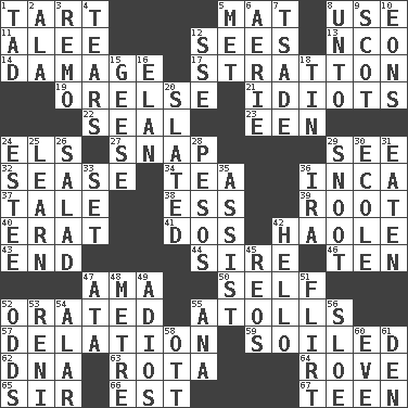 ACROSS 1. Small pie 5. Floor protector 8. Purpose 11. Toward shelter 12. Observes 13. Non-commissioned officer (abbr.) 14. Break 17. Ski resort town in Vermont 19. Threatening words 21. Foolish or stupid persons 22. Lick closed 23. Car or cant ending 24. Raised railways 27. Fastener 29. Perceive with the eye 32. Gospel singer Marvin 34. Afternoon social gathering 36. South American Indian 37. Falsehood 38. Double-curved letter 39. Carrot, for example 40. Part of Q.E.F. 41. Two (Sp.) 42. White Person, in Hawaii 43. Conclusion 44. Male parent of an animal 46. "___ Little Indians" 47. Wet nurse (var.) 50. Automatically 52. Spoke pompously 55. Ringlike coral islands and reefs 57. Conveyance 59. Dirtied 62. Heredity factor (abbr.) 63. Round or rotation of duties 64. Be footloose 65. Title for a knight 66. Eastern Standard Time (abbr.) 67. Adolescent DOWN 1. Small amount or degree 2. Insect wing 3. San ____ (Riviera town) 4. Lacerates 5. Was introduced to 6. Nest on high 7. Sadhe (variant) 8. To (old English) 9. Highlander 10. Immeasurably long periods of time 12. Compass dir. 15. Honkers 16. Liveliness 18. Shallow baking pan 20. Scheduled 24. First name in cosmetics 25. Acquire or gain knowledge or skills 26. Vegetable dish 28. Mexican monetary units 29. Snob 30. Learning spot: Fr. 31. Ingested 33. Arrange properly for use 35. Help 36. Retirement account (abbr.) 42. Phone greeting 45. Vintage cars 47. "One Day ___ Time" 48. Distance measurement (Brit.) 49. Goodbye (Sp.) 51. Talk or behave amorously 52. Likelihood 53. Painter Guido (1575-1642) 54. Having or resembling wings 55. Santa ___, CA 56. _ gin 58. Baseball player Mel 60. Night before a holiday 61. Lair