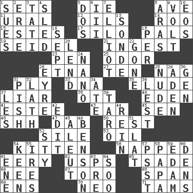 ACROSS 1. Arranges properly for use 5. Expire 8. "___ Maria" 11. Mountain range 12. Petroleums 14. Friend of Pooh 15. _____ Park, CO 17. Grain storage tower 18. Friends 19. Beer mug 21. Consume 23. Animal enclosure 25. Scent 26. Inactive volcano in Sicily 27. Nine, plus one 28. Tired old horse 31. Apply oneself diligently 33. Heredity factor (abbr.) 35. Evade 37. One who doesn't tell the truth 38. Baseball player Mel 40. Genesis locale 41. First name in cosmetics 43. Hearing organ 45. Elected rep. 46. Quiet! 47. Small moist lump or mass 50. Remainder 52. Filth; sediment 53. Lubricate 54. Baby cat 56. Slept 61. Suggestive of the supernatural 62. United States Postal Service (abbr.) 65. Sadhe (variant) 66. Born 67. "Corrida" creature 68. Connect, as a bridge 69. Followers of ems 70. Modern: prefix 71. Scottish caps DOWN 1. Institutes legal proceedings 2. Celtic language 3. Jacques of French films 4. Downhill vehicle 5. Two (Sp.) 6. One more than two 7. American author Paul (1891-1958) 8. Ancient river in northeast Turkey 9. Electrical Unit 10. Greek goddess of the dawn 13. Something which is sent 16. Back-to-school mo. 18. For each 20. Grant temporary use of 22. Went 24. Billionth: prefix 26. Jane of fiction 28. Unadorned 29. An important port of Yemen 30. Commissioned military rank (abbr.) 31. Expression of disdain 32. Thin strip of wood or metal 34. Had dinner 36. For fear that 37. French article 39. Pacific island yam 42. Prepare for publication 44. It's straight from the horse's mouth 48. Native American of Southwest Alaska 49. Gillaume's butler role 51. Narrow board 52. Filthy place 54. Peachy ____! 55. Angers 57. Inconspicuous attention getter 58. Dad 59. Dutch treat 60. Habitations of wild animals 61. Compass dir. 63. Before (prefix) 64. "Barney Miller" actor Jack
