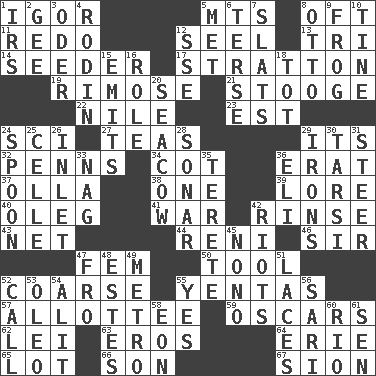 ACROSS 1. Russian composer Stravinsky 5. Mountains (abbr.) 8. Often (poetically) 11. Make new 12. Sew up the eyelids of hawks and falcons 13. Three (prefix) 14. Sowing specialist 17. Ski resort town in Vermont 19. Full of chinks, cracks, or crevices 21. Moe Howard, for one 22. The longest river in the world 23. Eastern Standard Time (abbr.) 24. _-fi 27. Beverages made from leaves 29. It is 32. Actor Sean's family 34. Small bed 36. Part of Q.E.F. 37. Spanish pot 38. Single 39. Old wives' tales, e.g. 40. Cassini of fashion 41. Armed conflict 42. Remove soap 43. Fish or hair follower 44. Painter Guido (1575-1642) 46. Title for a knight 47. Opposite of masc. 50. Instrument 52. Unrefined 55. Gossips 57. One to whom something is allotted 59. Motion picture awards 62. Flowery wreath 63. Greek god of love 64. One of the Great Lakes 65. Car dealer's back yard 66. Boy, to dad 67. The Jewish people; Israel DOWN 1. Big collection agency 2. Unit of force equal to gravity 3. Baltic tributary 4. "The Thinker" sculptor 5. Was introduced to 6. Laconic 7. Narrow boards 8. Von Bismarck 9. Tree-dwelling hopper 10. Prong on a fork 12. Compass dir. 15. Gives off 16. Hero or heavy, e.g. 18. Small child 20. Manatee 24. Soup utensil 25. Cell (Danish) 26. An arm off of a larger body of water 28. Echolocation 29. Metal shackles 30. Tarsus (plural) 31. Guide 33. Tired old horse 35. Cigar-shaped 36. Biblical high priest 42. Disturbances 45. Words to Nanette 47. From 48. _____ Park, CO 49. Paris' subway 51. Shoestrings 52. Give a ring to 53. Butter sub 54. Came down and settled, as after flight 55. It is so 56. Indian skirt 58. Age 60. _ de Janeiro 61. Elected rep.