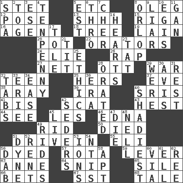 ACROSS 1. Proofreading order 5. And so on (abbr.) 8. Cassini of fashion 12. Airs 13. Quiet! 15. Port city in Latvia 16. Rep 18. Relationship diagram 19. (Had) reclined 20. Plant holder 22. Speakers 24. Writer Wiesel 26. Reproach for some lapse or misdeed 27. Remaining after all deductions 28. Baseball player Mel 29. Armed conflict 32. Adolescent 35. Possessive pronoun 37. First lady 38. Like ___ of sunshine 39. Retirement account (abbr.) 40. Indian titles of respect 41. Twice 42. Scram! 43. Behest 44. Perceive with the eye 45. French article 46. Pulitzer Prize-winning author Ferber 49. To free from 50. Passed on 51. Popular '50s hangout 55. Connecticut Ivy Leaguer 56. Colored 57. Round or rotation of duties 59. Crowbar 63. Queen of England 1702-14 64. Sever or remove by pinching or nipping 65. Drop; flow; fall 66. Antes 67. Fast jet (abbr.) 68. Story DOWN 1. Health resort 2. Coat; cloak 3. Compass dir. 4. 3-inch nail 5. Eastern Standard Time (abbr.) 6. Through, poetically 7. "Mermaids" star 8. Fourth or lowest deck 9. One who doesn't tell the truth 10. Armor plate that protects the chest 11. Separate the seeds from cotton 14. Centers of feelings and intuitions 17. Lacquered or enameled metalware 21. Teat (slang) 23. Make lace 25. Principles of right and wrong 28. Spoke pompously 29. We are 30. Advice 31. Relief 32. Bar bills 33. 4th largest of the Great Lakes 34. Comfort 36. Epoch 40. Most dubious of character or honesty 42. Spring feasts 45. 54 in ancient Rome 47. Expire 48. 1994 drama film starring Jodie Foster 49. Amusement-park features 51. Centimeter-gram-second unit of force 52. Monthly bill 53. Charged particles 54. Nuclear Threat Initiatives 56. Small moist lump or mass 58. Fitting 60. By way of 61. Pipe bend 62. Portuguese money of account (variant)