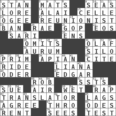 ACROSS 1. Comedian Laurel of Laurel & Hardy 5. Floor protectors 9. Oceans 13. Old wives' tales, e.g. 14. Jai _ 15. Cell (Danish) 16. Double curve, resembling the letter S 17. One who advocates reunion 19. Prohibit 20. Actress Charlotte 21. Republican Party 22. Greek goddess of the dawn 23. Indian skirt 25. Followers of ems 26. Leaves out 30. Norwegian king 34. Gold (Symbol: Au) 35. Grain storage tower 36. Demure 39. Bee-related 42. Quote 43. Travel on an animal 44. Climbing, woody, usually tropical vines 46. Baltic tributary 47. _ Allan Poe 48. Director Reiner 51. Fast planes 54. Institute legal proceedings 57. Atmosphere 58. Dripping 60. Strike 62. Interpreter 65. Falls behind 66. Match 67. Through, poetically 68. Lyric poems 69. Monthly bill 70. Perceives with the eye 71. Trial DOWN 1. Messy guy 2. Ancient Roman robes 3. Sports stadium 4. Born 5. Hindu Mythology: god of death 6. Toward shelter 7. The 19th letter of the Greek alphabet 8. Scorch 9. Elected rep. 10. Writer Wiesel 11. In addition 12. Arranges properly for use 15. 911 reaches them 18. Electrically charged atom 20. Tall New Zealand timber tree 24. Wanderer 27. Lyricist Gershwin 28. Uncastrated adult male sheep 29. Grin 30. Motion picture awards 31. Cards in a Roman deck? 32. Keyboard modifier key 33. Enemy 36. Adept person 37. To free from 38. Binary compound 40. Help 41. Tired old horse 45. Political cartoonist Thomas 48. To erase 49. Lubricate 50. Naughty children 52. Buy and sell 53. Gurus 54. Play the lead 55. Goad 56. Merit 58. Had on 59. Greek god of love 61. Inconspicuous attention getter 63. Fish or hair follower 64. Definite Article 65. Car dealer's back yard