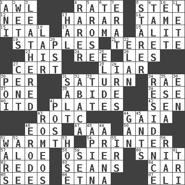 ACROSS 1. Leather borer 4. Pace 8. Proofreading order 12. Born 13. Ethiopian city, capital of Harari 14. Not wild 15. Slanted text style (abbr.) 17. Scent 18. Came down and settled, as after flight 19. Paper fasteners 21. Cylindrical with tapered ends 23. Part of HMS, perhaps 24. To sift 26. French article 27. Certainty 28. One who doesn't tell the truth 30. For each 31. Titan orbits this 34. Actress Charlotte 37. Single 38. Remain 39. Compass dir. 40. It would 41. Food holders 42. Elected rep. 43. College mil. group 44. Greek goddess of the earth (variant) 46. Greek goddess of the dawn 47. American Automobile Association (abbr.) 50. Added to 51. Heat 54. Hard copy producer 57. _ vera 58. Flexible twig of a willow tree 60. In a ____ (agitated or irritated) 62. Make new 63. Actors Connery and Penn 64. 4-wheeled motor vehicle 65. Perceives with the eye 66. Inactive volcano in Sicily 67. Connecticut Ivy Leaguer DOWN 1. Cuckoo 2. Soaks 3. Tough but pliablecoriaceous 4. Less widely known 5. Came up 6. Scottish cap 7. Part of Q.E.F. 8. A viewer who gazes fixedly 9. Stories 10. Send forth 11. Wig 13. Actor Linden 16. Den 20. Pacific Standard Time (abbr.) 22. Enthusiasm 25. Evade 27. Penny 29. Angers 30. Luau course 31. Table seasoning 32. Phillipine bananalike plant 33. Teat (slang) 34. Dwelling 35. At sea 36. Car or cant ending 41. Mail 43. Lover boys 44. Separate the seeds from cotton 45. Pismires 46. Wear away 48. Bee-related 49. Sports stadium 51. Armed conflicts 52. Toward shelter 53. Flexible conduit 55. Big collection agency 56. Monetary unit of Yemen 59. Put into a specified state 61. Three (prefix)