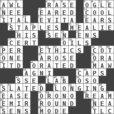 ACROSS 1. Leather borer 4. Raze (variant) 8. Stare at amorously 12. Born 13. Having ears or earlike features 14. Calm and collected 15. Slanted text style (abbr.) 17. Webber/Rice musical 18. Hearing organs 19. Paper fasteners 21. Ear of corn 23. Part of HMS, perhaps 24. Elected rep. 26. Followers of ems 27. Sure thing 28. Petroleums 30. For each 31. Moral principles 34. Small bed 37. Single 38. Came up 39. Mouth or opening 40. It would 41. Spoke pompously 42. Informal term for the mouth 43. Hindu god of fire 44. Balmoral and tarboosh 46. Compass dir. 47. Experiment locale 50. Bear (Spanish) 51. Scheduled 54. Yearning 57. Comfort 58. U. of Maine site 60. 480, 500 or 516 sheets of paper 62. Arab leader 63. Unit of ammunition 64. Teachers' org. 65. Elected reps. 66. Method 67. Affectionate concern, for short DOWN 1. Cuckoo 2. Moistens 3. Tough but pliablecoriaceous 4. All-night dance parties 5. Ascend 6. Arrange properly for use 7. Dutch treat 8. Seas 9. Finish lines 10. Australian parrot (variant) 11. Otherwise 13. Snakelike fish 16. Den 20. Pacific Standard Time (abbr.) 22. Snakelike fish 25. Annoying sound 27. Penny 29. On the rocks 30. Luau course 31. Merit 32. Lag or linger behind 33. Being at a high temperature 34. Piece 35. Mouths or openings 36. The 23rd letter of the Hebrew alphabet 41. Double curve, resembling the letter S 43. Michaelmas daisies 44. Gear tooth 45. SW Saudi Arabia district 46. Indian antelope 48. Verbally 49. Child's nurse 51. Perceives with the eye 52. Unable to walk 53. Dormintory (informal) 55. Lower and raise head in agreement 56. Highlander 59. Friend of Pooh 61. Apple computer (short form)
