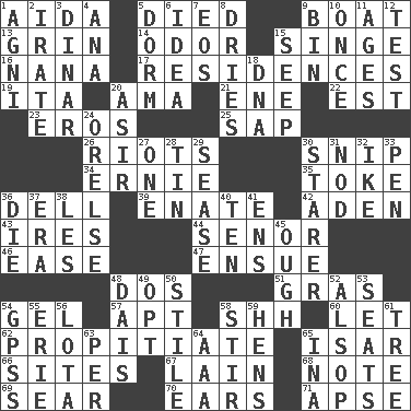 ACROSS 1. Opera by Verdi 5. Passed on 9. Water vessel 13. Amused look 14. Aroma 15. Scorch 16. Nanny 17. Homes 19. Call ___ day 20. Nursemaid (var.) 21. Compass dir. 22. Eastern Standard Time (abbr.) 23. Greek god of love 25. Plant excrement 26. Debaucheries 30. Sever or remove by pinching or nipping 34. Bert's buddy 35. Puff or smoke 36. Small valley 39. Maternal 42. An important port of Yemen 43. Angers 44. Sir (Sp.) 46. Relaxation 47. Take place subsequently 48. Two (Sp.) 51. Pate de foie ____ 54. Set 57. Fitting 58. Quiet! 60. Allow 62. Conciliate 65. Austrian river, tributary to the Danube 66. Locates 67. (Had) reclined 68. Musical sound 69. Scorch 70. Hearing organs 71. Domed church section DOWN 1. Hindu god of fire 2. Feeling or showing extreme anger 3. Middle Eastern gold or silver currency 4. Santa ___, CA 5. Dormintory (informal) 6. It may be bright or harebrained 7. Greek goddess of the dawn 8. Frees from moisture 9. Storage container 10. Single time 11. Eons 12. Trial 15. Ooze 18. Heredity factor (abbr.) 20. SW Saudi Arabia district 24. Threatening words 27. Single 28. Shallow baking pan 29. Gospel singer Marvin 30. A viewer who gazes fixedly 31. Allow head to fall sleepily 32. D.D.E's nickname 33. Fenced enclosure 36. Expire 37. Epoch 38. French article 40. "___ Little Indians" 41. Followers of ems 45. Ending for "Through" and "Enough" 48. Raised platform 49. Elect 50. Vertical member of a panel or frame 52. Columnist Joseph or Stewart 53. Theater features 54. Global Positioning Systems (abbr.) 55. One of the Great Lakes 56. Globular water bottle used in Asia 58. Use a swizzle stick 59. Coop moms 61. Relationship diagram 63. For each 64. American Automobile Association (abbr.) 65. _ tizzy (2 wds.)