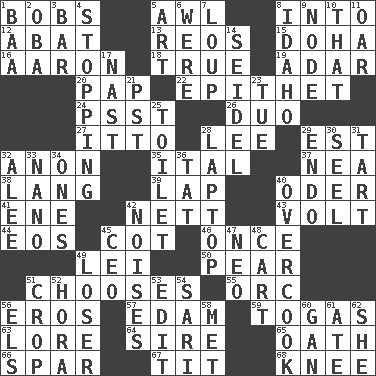 ACROSS 1. Moves up and down 5. Leather borer 8. To the inside or interior of 12. Blind as ____ 13. Vintage cars 15. Capital of the state of Qatar 16. Composer Copland 18. Loyal 19. The sixth month of the Jewish calendar 20. Infant food 22. Curse 24. Inconspicuous attention getter 26. Superhero pair 27. "Tell ____ the Marines!" 28. Area sheltered from the wind 29. Eastern Standard Time (abbr.) 32. Soon (poet.) 35. Slanted text style (abbr.) 37. Teachers' org. 38. Long (Scottish) 39. Infant locale 40. River in Europe 41. Compass dir. 42. Remaining after all deductions 43. Electrical Unit 44. Greek goddess of the dawn 45. Small bed 46. At one time in the past 49. Luau accessory 50. Lightbulb-shaped fruit 51. Opts 55. The grampus (Milton) 56. Greek god of love 57. Dutch treat 59. Ancient Roman robes 63. Old wives' tales, e.g. 64. Father 65. Pledge 66. Practice fight 67. Teat (slang) 68. Leg joint DOWN 1. Sound made by sheep 2. Chief or king in Benin or Nigeria 3. Long, evenly shaped piece 4. Discontinuing 5. Tate display 6. Past tense of be (plural) 7. Central Nebraska county 8. Potato state 9. Thickened enlargement 10. Not this but _ 11. Rowing implement 14. A glass for beer 17. Political cartoonist Thomas 21. Pacific Standard Time (abbr.) 23. Third day of the wk. 25. Bathroom 28. Portable computer 29. Inside; within (prefix) 30. Stitch closed the eyes of (a falcon) 31. Small pie 32. Toward shelter 33. Billionth: prefix 34. Singles 36. Make lace 40. Burn the roast 42. Annoying sounds 45. Corporate head (abbr.) 47. Modern: prefix 48. Haul 49. Failure 51. Riding implement 52. Israeli folk dance 53. Prepare for publication 54. Indian skirt 56. Raised railways 58. Was introduced to 60. Separate the seeds from cotton 61. Had dinner 62. A female animal or person