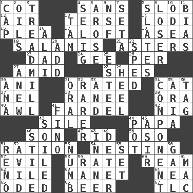 ACROSS 1. Small bed 4. Without 8. Messy guy 12. Wind 13. Laconic 14. Farming town in central California 15. Entreaty 17. High up in or into the air 18. Toward the sea 19. Deli grouping 21. Michaelmas daisies 23. Male parent 24. Turn to the right 26. For each 27. Among 28. "______ My Girl" (Turtles hit) 30. Cuckoo 31. Declaimed 34. Domesticated feline 37. Cartoonist voice _ Blanc 38. The wife of a rajah (variant) 39. Mouth or opening 40. Leather borer 41. Burden 42. Russian fighter aircraft 43. Filth; sediment 44. Dad 46. Boy, to dad 47. To free from 50. Bear (Spanish) 51. Food allowance for one day 54. Snuggling 57. Morally bad or wrong 58. A salt of uric acid 60. 480, 500 or 516 sheets of paper 62. Mediterranean tributary 63. French painter Edouard 64. Teachers' org. 65. Wrote a lyric poem 66. Fermented drink made from hops 67. Affectionate concern, for short DOWN 1. Head covering 2. Petroleums 3. Excercise machine 4. Major League Baseball Commissioner Bud 5. Came up 6. Overdraft (abbr.) 7. Bristle 8. Chalkboards 9. Failure 10. River in Europe 11. Prejudice 13. Scottish cap 16. Mountain range southwest of Kyrgyzstan 20. Say or write further 22. Drove too fast 25. First name in cosmetics 27. Afresh 29. Person who is morally reprehensible 30. Housemaid (var.) 31. Taken by mouth 32. More valued for its uncommonness 33. Added to 34. Piece 35. Operatic vocal solo 36. Label 41. A pale, very dry sherry 43. Dirtied 44. Plant holder 45. SW Saudi Arabia district 46. Vertical member of a panel or frame 48. Lacking in sense or substance 49. Prevent from occurring 51. Western Nevada city 52. Enthusiastic 53. Unfeeling 55. Arrange properly for use 56. Highlander 59. Actress Charlotte 61. Apple computer (short form)