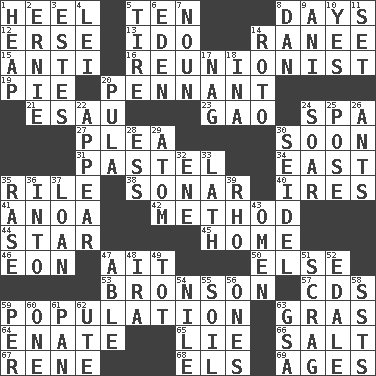 ACROSS 1. Person who is morally reprehensible 5. "___ Little Indians" 8. 24-hour periods 12. Celtic language 13. Wedding promise 14. The wife of a rajah (variant) 15. Against 16. One who advocates reunion 19. Sliced dessert 20. Pre-World Series prize 21. He sold his birthright 23. E Mali city 24. Health resort 27. Entreaty 30. Within a short period 31. Soft color 34. 90 degrees 35. Cause heat under the collar 38. Echolocation 40. Angers 41. Small Philippine buffalo 42. Mode 44. Play the lead 45. Residence 46. Age 47. Small island 50. Otherwise 53. "Death Wish" actor 57. Music discs 59. Census information 63. Pate de foie ____ 64. Related on the mother's side 65. Falsehood 66. Table seasoning 67. French philosopher Descartes 68. Raised railways 69. Eras DOWN 1. Pile 2. Bert's buddy 3. _____ Park, CO 4. Flowery wreath 5. Become fatigued 6. Paradise 7. Part of speech 8. Daniel's nick name 9. Cuckoo 10. Affirmative reply 11. Arrange properly for use 14. Printing process, for short 17. Tired old horse 18. _ tizzy (2 wds.) 20. Monetary unit of Botswana 22. Seem 24. Fly high 25. Introduce or present, as a question 26. Pismires 28. Curvy letter 29. Tiny particle 30. Beer mug 32. Compass dir. 33. Thin strip of wood or metal 35. Raze (variant) 36. To the inside or interior of 37. Grant temporary use of 39. 17th letter of the Greek alphabet 43. Presage 47. Competent 48. Retirement account (abbr.) 49. Small child 51. Lean end of the neck 52. Peak District village in England 54. The longest river in the world 55. Earth 56. Washington bills 58. Fast planes 59. For each 60. Single 61. Baking dish 62. Shoshoni 63. Girls' org. (abbr.)