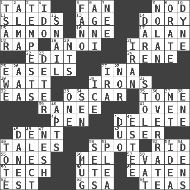ACROSS 1. Jacques of French films 5. Air blower 8. Lower and raise head in agreement 11. Bobsleighs 13. Mature 14. Small, narrow, flatbottom fishing boat 15. ID or VA city 16. Compass dir. 17. ____ Jay Lerner 18. Reproach for some lapse or misdeed 19. Mine, in Marseilles 21. Feeling or showing extreme anger 22. Prepare for publication 24. French philosopher Descartes 25. Artist's stands 27. _ tizzy (2 wds.) 29. Electrical Unit 30. Metal shackles 32. Relaxation 33. Motion picture award 35. Heavy book 39. Indian princess (variant) 41. Baking chamber 42. Fenced enclosure 43. Keyboard key 45. Incision 48. One who makes use of a thing 49. Lies 50. Specific locale 52. To free from 55. Singles 56. Cartoonist voice _ Blanc 57. Elude 59. Technology 60. Shoshoni 61. Ingested 62. Eastern Standard Time (abbr.) 63. Girls' org. (abbr.) 64. Afternoon social gatherings DOWN 1. Russian ruler of old 2. _ mater 3. Storms 4. Wedding promise 5. Papal veil 6. Hindu god of fire 7. Born 8. Pitcher Ryan 9. Declaim 10. Unit of force 12. Slow-paced one 14. Have the gumption 20. Mountains (abbr.) 21. SW Asia republic 23. Prevent from occurring 25. She-sheep 26. Auto club (abbr.) 27. Retirement account (abbr.) 28. Not either 30. Frozen water 31. Fur scarf 33. Single 34. Elected rep. 36. Make much ado about nothing 37. Was introduced to 38. Compass dir. 40. Flats, for short 43. Superhero pair 44. First name in cosmetics 45. Natives or inhabitants of Denmark 46. Opt 47. Tender 49. Carry 50. Arranges properly for use 51. Entreaty 53. The main thing one is thinking about 54. Cub Scout units 56. Large cup 58. Large container