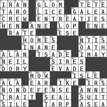 ACROSS 1. SW Asia republic 5. Seize upon or latch onto something 9. False hair 13. Edible starchy tuberous root 14. Louse (plural) 15. An organ shaped like a helmet 16. Group working together 17. Pleas 19. Layer 20. One (Scot) 21. Trim (branches) 22. Compass dir. 23. Pace 25. Compass dir. 26. Residences 30. Nuclear Threat Initiatives 34. Lacking in sense or substance 35. Pledge 36. Actor Alda or Thicke 39. Sadhe (variant) 42. "If ____ say so..." 43. Famous astronaut Armstrong 44. Titles for men of rank and authority 46. Rowboat 47. Dodge 48. Cut the grass 51. Capri or Wright 54. Insect wing 57. Ewer handle 58. Mamie's husband 60. Big collection agency 62. Unrelated to defense, as in spending 65. Singer Murray 66. Distinguishing feature 67. Lick closed 68. Costume for a special activity 69. Filth; sediment 70. Canvas cover 71. Toward the sea DOWN 1. Hankering 2. Less widely known 3. Sports stadium 4. At this time 5. Small, secluded valley 6. Actor's bit 7. Sep. follower 8. Haggard of country music 9. Make lace 10. Writer Wiesel 11. Adolescent 12. Relaxation 15. Open wide 18. Greek goddess of the dawn 20. Age 24. Without viscosity 27. Floor protector 28. Followers of ems 29. Gospel singer Marvin 30. Annoying sounds 31. Scottish cap 32. Call ___ day 33. Like a shrinking violet 36. Added to 37. Lion 38. Atmosphere 40. HTML Container Element 41. Period 45. Singer Brickell 48. Confront 49. Clumsy lout 50. Obtain by seizing forcibly or violently 52. "_ and Lucy" (Charlie Brown theme song) 53. Bert's buddy 54. Pismires 55. Australian parrot (variant) 56. Of or related to the anus 58. Austrian river, tributary to the Danube 59. Seaweed 61. Stalk of a moss capsule 63. Pass on 64. Teachers' org. 65. White ___ sheet