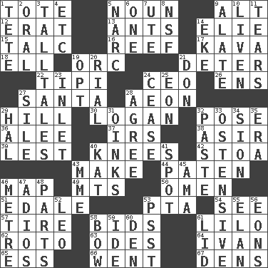 ACROSS 1. Haul 5. Part of speech 9. The first octave above the treble staff 12. Part of Q.E.F. 13. Pismires 14. Writer Wiesel 15. Baby powder 16. Coral ridge 17. Polynesian shrub of the pepper family 18. Pipe bend 19. The grampus (Milton) 21. Prevent from occurring 22. Native american tent (variation) 24. Corporate head (abbr.) 26. Followers of ems 27. Before Barbara or Clara 28. Period of immesurable duration 29. Land elevation 30. Utah city north of Ogden 32. Airs 36. Toward shelter 37. Big collection agency 38. SW Saudi Arabia district 39. For fear that 40. Leg joints 42. Portico 43. Cause to be 44. Eucharist need 46. Atlas unit 49. Mountains (abbr.) 50. Presage 51. Peak District village in England 53. Parent Teacher Assoc. 54. Perceive with the eye 57. Become fatigued 58. Auction offers 61. _ and Stitch 62. Printing process, for short 63. Lyric poems 64. "Terrible" tsar 65. Double-curved letter 66. Gone 67. Cub Scout units DOWN 1. Wig 2. Relating to the mouth 3. Baron Munchausen's specialties 4. And so on (abbr.) 5. Drug cop 6. Single 7. Shoshoni 8. Overdraft (abbr.) 9. Having winglike extensions 10. Make or become more lively 11. Separates forcefully 14. Make supply last 19. Choose 20. Monetary unit of Yemen 21. Spanish title 23. An arm off of a larger body of water 24. Desist 25. Period of immesurable duration 27. Filth; sediment 28. Match 29. Actor Linden 31. Pig sounds 32. Thick mixture 33. Clearly or manifestly demonstrative 34. The Jewish people; Israel 35. Period 40. Krazy ___ of comics 41. Specific locale 43. Madame (abbr.) 45. Housemaid (var.) 46. Distance measurement (Brit.) 47. Goodbye (Sp.) 48. Actors' quests 52. Lion 53. Inconspicuous attention getter 55. Enthusiasm 56. Immeasurably long periods of time 58. Arrow shooter 59. Binary compound 60. Lair 61. Flaplike covering