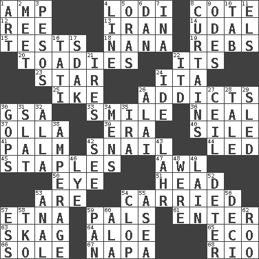 ACROSS 1. Electrical Unit 4. Farming town in central California 8. ____ d'Azur (French Riviera) 12. To riddle 13. SW Asia republic 14. Hereditary estate 15. Trials 18. Grandmother 19. Confederate soldiers (slang) 20. Sycophants 22. ___ a Wonderful Life 23. Play the lead 24. Call ___ day 25. Mamie's mate 26. Inveterate users 30. Girls' org. (abbr.) 33. Grin 36. Be tempered by heat 37. Water jar 39. Epoch 40. Drop; flow; fall 41. Inside of hand 42. Slow-paced one 44. Directed 45. Paper fasteners 47. Leather borer 50. Sight organ 51. Froth on beer 53. "We ___ not amused" (Victoria) 54. Borne 57. Inactive volcano in Sicily 59. Friends 61. Keyboard key 63. Heroin 64. Medicinal plant 65. Environmental prefix 66. Flatfish 67. California wine valley 68. _ de Janeiro DOWN 1. Tate display 2. Confront 3. Mexican monetary units 4. Actor's bit 5. Mouths or openings 6. One of the 12 tribes of Israel 7. _ tizzy (2 wds.) 8. Window treatments 9. Lyric poems 10. Keyboard key 11. Raised railways 16. Jacques of French films 17. Neighbor of Neb. 21. Angers 22. It would 24. Binary compound 26. Jai ____ 27. To provide with a ceiling 28. Lie 29. Downhill vehicle 30. Republicans 31. Narrow board 32. Silent film actress Nazimova 34. Not women's 35. Retirement account (abbr.) 38. Electrical Measurement 42. Perceive with the eye 43. Cowardly lion portrayer 46. Sodium hydroxide 48. Past tense of be (plural) 49. (Had) reclined 52. Prevent from occurring 53. Of or related to the anus 54. Hoof sound 55. At sea 56. Tenth: prefix 57. Double-curved letter 58. Ring climax 59. Baking dish 60. According to 62. Friend of Pooh