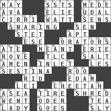 ACROSS 1. Fifth month 4. Fast planes 8. Ancient Persian 12. Actress Gardner 13. Writer Wiesel 14. Allodial 15. High-altitude cloud 18. Electrical Unit 19. Elected reps. 20. Catching in a trap 22. Elected rep. 23. Proofreading order 24. Fitting 25. Compass dir. 26. Speakers 30. Had dinner 33. Intended 36. One of the Great Lakes 37. Be footloose 39. Affectionate concern, for short 40. Table seasoning 41. So be it 42. An arm off of a larger body of water 44. French article 45. French poetic form 47. Friend of Pooh 50. To free from 51. Dutch treat 53. Luau accessory 54. Leopard's kin 57. Toward the sea 59. Hoop that covers a wheel 61. Tear up 63. Left 64. Baltic tributary 65. Beverage made from leaves 66. Kenny Rogers chart-topper in '80 67. Leaves 68. Insidious DOWN 1. Big _ 2. Advice 3. Entertaining tales 4. Stitched 5. Volcanic refuse 6. Teat (slang) 7. Arrange properly for use 8. French bagpipes 9. Paradise 10. One of the 12 tribes of Israel 11. Raised railways 16. Assign a rank or rating to 17. Angers 21. A distinct part 22. Health resort 24. Nonscientific branch of learning 26. At one time in the past 27. Relating to the mouth 28. Cause heat under the collar 29. Puts into a specified state 30. Ancient river in northeast Turkey 31. Heavy book 32. Nights before holidays 34. Inactive volcano in Sicily 35. Everything 38. Plea 42. Working for oneself (abbr.) 43. Woody plant 46. One more than two 48. Lyric poems 49. Pledge 52. Shops 53. Grant temporary use of 54. Algonquian 55. Possessive pronoun 56. Person who is morally reprehensible 57. Leather borer 58. Ocean 59. Coat; cloak 60. Wedding promise 62. 24 hours