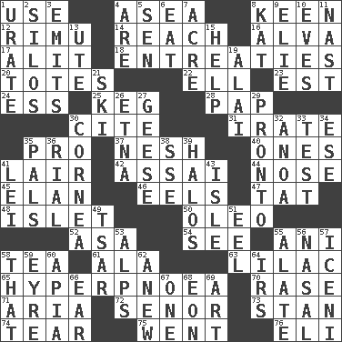 ACROSS 1. Purpose 4. Toward the sea 8. Peachy ____! 12. Tall New Zealand timber tree 14. Arrive at 16. Inventor's middle name 17. Set down 18. Pleas 20. Lugs 22. Pipe bend 23. Eastern Standard Time (abbr.) 24. Double-curved letter 25. Cask 28. Infant food 30. Quote 31. Feeling or showing extreme anger 35. Adept person 37. Soft 40. Washington bills 41. Den 42. Slender Brazilian palm 44. Characteristic smell of wine 45. Style 46. Snakelike fish 47. Make lace 48. Small island 50. Butter sub 52. White ___ sheet 54. Perceive with the eye 55. Black tropical American cuckoo 58. Beverage made from leaves 61. In the manner of 63. Pale purple color 65. Abnormally rapid or deep breathing 70. Raze (variant) 71. Operatic vocal solo 72. Sir (Sp.) 73. Comedian Laurel of Laurel & Hardy 74. Pull into pieces 75. Left 76. Connecticut Ivy Leaguer DOWN 1. A salt of uric acid 2. Grain storage towers 3. Gives off 4. "We ___ not amused" (Victoria) 5. Elected rep. 6. Erode 7. 43,560 square feet 8. Krazy ___ of comics 9. Writer Wiesel 10. Nights before holidays 11. Political cartoonist Thomas 13. Shoshoni 15. Assist 19. Jai _ 21. What Jean-Claude Killy likes to do 26. Inactive volcano in Sicily 27. Honkers 29. Right away 30. Pupil covering 32. Small Philippine buffalo 33. Trial 34. Compass dir. 35. Friends 36. Monetary unit of Yemen 38. Compass dir. 39. Saint headwear 41. Luau accessory 43. Capri or Wright 49. Russian ruler of old 51. Snakelike fish 53. High mountains 55. Having winglike extensions 56. Relating to the nose 57. Ancient Celtic tribe of eastern Britain 58. Not this but _ 59. Jane of fiction 60. Capital of Western Samoa 62. Afresh 64. Big collection agency 66. Hearing organ 67. Single 68. A really long time 69. Tate display