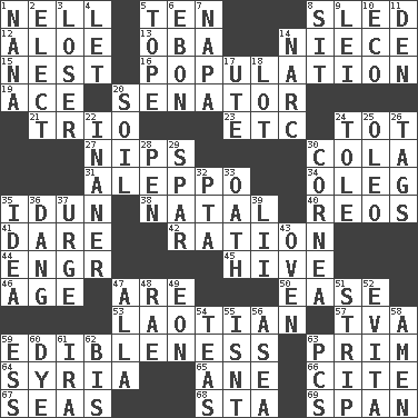 ACROSS 1. 1994 drama film starring Jodie Foster 5. Nine, plus one 8. Downhill vehicle 12. _ vera 13. Chief or king in Benin or Nigeria 14. Sibling's daughter 15. Egg locale 16. Census information 19. Adept person 20. Legislator 21. Musical group of three 23. And so on (abbr.) 24. Small child 27. Pinches, bites 30. Root beer relative 31. City in Syria 34. Cassini of fashion 35. Goddess of spring and wife of Bragi 38. Relating to or accompanying birth 40. Vintage cars 41. Have the gumption 42. Food allowance for one day 44. Engineer (abbr.) 45. Hub of activity 46. Ripen 47. "We ___ not amused" (Victoria) 50. Relaxation 53. Of or relating to Laos or its people 57. Federal power corp. 59. The property of being fit to eat 63. Demure 64. Damascus' land 65. A saturated hydrocarbon 66. Quote 67. Oceans 68. R.R. building 69. Connect, as a bridge DOWN 1. Nanny 2. Voters do this 3. Failure 4. Allow 5. Drink excessively 6. Inky black, to poets 7. California wine valley 8. Be seated 9. Luau accessory 10. Environmental prefix 11. Lair 14. Drug cop 17. Shoshoni 18. Car dealer's back yard 20. Earth 22. Sillier 24. Lacquered or enameled metalware 25. Butter sub 26. Labels 28. Animal enclosure 29. Practice fight 30. Pupil covering 32. Parent Teacher Association (abbr.) 33. Pledge 35. The content of cognition 36. Mild oath, euphamism for damn 37. Goad 39. Cards in a Roman deck? 43. Baking chamber 47. Silent film actress Nazimova 48. Actress Charlotte 49. Age 51. Remove all contents or possession from 52. Webber/Rice musical 54. Beverages made from leaves 55. Is not 56. Toward the sea 58. So be it 59. Curvy letter 60. Color 61. Lyricist Gershwin 62. Again 63. Personal Computers (abbr.)