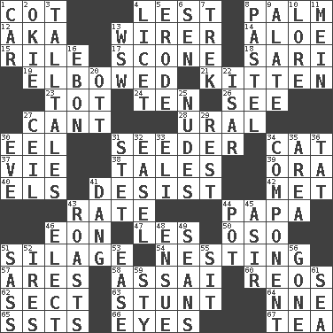 ACROSS 1. Small bed 4. For fear that 8. Inside of hand 12. Alias (abbr.) 13. One who wires 14. Medicinal plant 15. Cause heat under the collar 17. Biscuitlike quick bread 18. Indian skirt 19. Turned at an angle; bent 21. Baby cat 23. Small child 24. "___ Little Indians" 26. Observe 27. Patter 28. Mountain range 30. Snakelike fish 31. Sowing specialist 34. Feline 37. Compete 38. Lies 39. Mouth or opening 40. Raised railways 41. Stop 42. Was introduced to 43. Assign a rank or rating to 44. Dad 46. A really long time 47. French article 50. Bear (Spanish) 51. Fodder prepared in a silo 54. Inhabiting a nest 57. Ancient Greek god of war 58. Slender Brazilian palm 60. Vintage cars 62. Religious group 63. Difficult or unusual or dangerous feat 64. Compass dir. 65. Fast planes 66. Sight organs 67. Beverage made from leaves DOWN 1. Automobile 2. Migrant worker of the '30s 3. Baron Munchausen's specialties 4. It is permitted: Lat. 5. Eat (away) 6. Elected rep. 7. Long journey 8. Soft color 9. Having winglike extensions 10. Old wives' tales, e.g. 11. Count _ (2 wds.) 13. Compass dir. 16. Inky black, to poets 20. Baseball player Mel 22. Austrian river, tributary to the Danube 25. Unclothed pictures 27. To provide with a ceiling 29. Remainder 30. First lady 31. Proofreading order 32. Artist's stand 33. Biblical high priest 34. Part 35. Type of rug 36. Make lace 41. Mild oath, euphamism for damn 43. Cooks with dry heat, as in an oven 44. Plant holder 45. SW Saudi Arabia district 46. Choose 48. Follow as a consequence or result 49. Seines 51. Backtalk 52. Angers 53. Comfort 55. Be seated 56. Went 59. Filthy place 61. Ocean