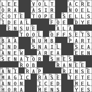 ACROSS 1. Area sheltered from the wind 4. Electrical Unit 8. 1/640 square mile 12. Mouth or opening 13. SW Saudi Arabia district 14. Christmas carol 15. ____ d'Azur (French Riviera) 17. Drink excessively 18. Makes a sale 19. Standard of perfection 21. Enemy 23. Color 24. Take place subsequently 26. Chicken ___ king 28. Instrument 30. Counterbalances 34. Sound made by sheep 37. Unfeeling 39. Role in a play 40. Working for oneself (abbr.) 41. Slow-paced one 43. Ocean 44. Afresh 46. Length times width 47. Car or cant ending 48. Legislator 51. "______ My Girl" (Turtles hit) 54. Director Reiner 55. Indian princess (variant) 58. Cuckoo 61. Hit sharply and swiftly 63. Remove soap 65. Mysterious quality of enchantment 67. To erase 71. False hair 72. Soon (poet.) 73. On the rocks 74. Cartoonist voice _ Blanc 75. Israeli folk dance 76. Not women's 77. Consenting reply DOWN 1. Event scenes 2. Wear away 3. Consumed 4. Large container 5. Bear (Spanish) 6. Mouth edge 7. Unclean, religiously 8. One (Scot) 9. Having a low temperature 10. Depend 11. Otherwise 16. Compass direction 18. Itself 20. Nilotic language 22. Clumsy lout 25. Immeasurably long periods of time 27. Viper 29. Type of eclipse 30. Off-Broadway awards 31. Comfort 32. Woody plant 33. Comedian Laurel of Laurel & Hardy 34. Prejudice 35. Queen of England 1702-14 36. An important port of Yemen 38. Third mo. 42. Cowardly lion portrayer 45. Armed conflict 49. Torque (variant) 50. Chief or king in Benin or Nigeria 52. Hearing organ 53. In a ____ (agitated or irritated) 56. Foe 57. First name in cosmetics 58. Nanny 59. Billionth: prefix 60. Russian composer Stravinsky 62. Demure 64. Snakelike fish 66. _ tizzy (2 wds.) 68. Adept person 69. Elected rep. 70. Begley and Asner