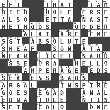 ACROSS 1. Newt 4. Not this but _ 8. Scottish cap 11. Passed on 13. Hollow 14. Celtic language 15. In addition 16. Singer James 17. Political cartoonist Thomas 18. Modes 21. More peculiar 22. Jai ____ 23. Sandy's bark 25. Compass dir. 26. Fast jet (abbr.) 29. Utter; complete 32. To gather and bind into a bundle 34. Boy, to dad 35. "One Day ___ Time" 38. Put on (as clothing) 39. It is permitted: Lat. 41. Saudi Arabian king (1953-1964) 43. Compass dir. 44. Mouth or opening 45. Phone greeting 46. Electrical Measurement 50. Begley and Asner 51. Ocean 54. Double-curved letter 55. Drinking establishments 57. Therefore, facetiously 59. Motivate 63. Leaves 64. Mild oath 67. Of or related to the anus 68. Pulitzer Prize-winning author Ferber 69. Lacquered or enameled metalware 70. Nuclear Threat Initiatives 71. Arrange properly for use 72. Lacking warmth 73. Single DOWN 1. Dutch treat 2. Do some clerical work 3. Trial 4. College paper 5. Being at a high temperature 6. The first octave above the treble staff 7. Beverage made from leaves 8. Barter 9. NE Netherlands city 10. Distance measurement (Brit.) 12. Capital of the state of Qatar 14. Conclude 19. Norwegian king 20. Apply (a substance) by light strokes 21. Often (poetically) 23. Medicinal plant 24. The smallest animal of a litter 26. Compass dir. 27. "______ My Girl" (Turtles hit) 28. Beverages made from leaves 30. Motion picture award 31. Comfort 33. Type of rug 36. Story 37. Old (Scot.) 39. Chops off 40. Angers 42. Two (Sp.) 45. Possessive pronoun 47. Cartoonist voice _ Blanc 48. Stayed 49. Separate the seeds from cotton 51. Gurus 52. Wear away 53. Representative 56. Connect, as a bridge 58. White ___ sheet 60. To the inside or interior of 61. Precipitation 62. Otherwise 64. And so on (abbr.) 65. Thick or sticky substance 66. Everything