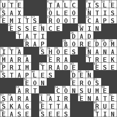 ACROSS 1. Shoshoni 4. Baby powder 8. Small island 12. Saxophone 13. Butter sub 14. Nuclear Threat Initiatives 15. Sends forth 18. Carrot, for example 19. Smile enhancers 20. Gist 22. Victory 23. Jacques of French films 24. June honoree 25. Reproach for some lapse or misdeed 26. Mood resulting from idleness 30. Call ___ day 33. Imelda's hoard 36. Grandmother 37. Hindu Mythology: god of death 39. Period 40. Long journey 41. Demure 42. Swap 44. Compass dir. 45. Paper fasteners 47. Lair 50. Age 51. Greek god of love 53. Nonscientific branch of learning 54. Ingest 57. "Two Mules for Sister ____" 59. Den 61. Related on the mother's side 63. Heroin 64. Singer James 65. Sorrow 66. Relaxation 67. Observes 68. Metal container DOWN 1. Purpose 2. Docile 3. Be extant 4. Torque (variant) 5. _ vera 6. Lion 7. Small bed 8. Happening 9. Comedian Laurel of Laurel & Hardy 10. Mouth edge 11. Curvy letter 16. Russian ruler of old 17. Bristle 21. Cuts off 22. Armed conflict 24. Two (Sp.) 26. Necklace unit 27. Have the gumption 28. Singles 29. Cause to be 30. Naughty children 31. Small pie 32. Roberta Peters solo 34. Possessive pronoun 35. Mouth or opening 38. Electrical Measurement 42. "___ Little Indians" 43. Locale of original sin 46. Car dealer's back yard 48. Celtic language 49. Part of speech 52. Don Adams' spy role 53. Caspian sea tributary 54. Quote 55. Mouths or openings 56. Needle case 57. Compass dir. 58. Alias (abbr.) 59. French article 60. Had dinner 62. Car or cant ending